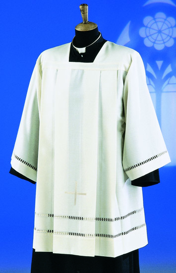 These surplices are styled with a square neck and include four pleats in the front and back. Beautiful, detailed hand embroidery is available in a wide range of liturgical colors.