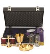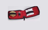 This compact silver travel Mass kit offers a complete portable solution for celebrating the Eucharist away from the parish. Measuring 9.5" x 6.5" x 3", the set is crafted to serve the needs of missionary priests, military chaplains and clergy who require a reliable Mass kit for travel or emergency ministry.