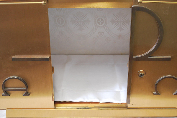 This is a used bronze tabernacle with double sliding doors. The overall measurements are 19 3/4" wide x 15 1/2" tall x 15 1/2" deep.