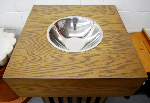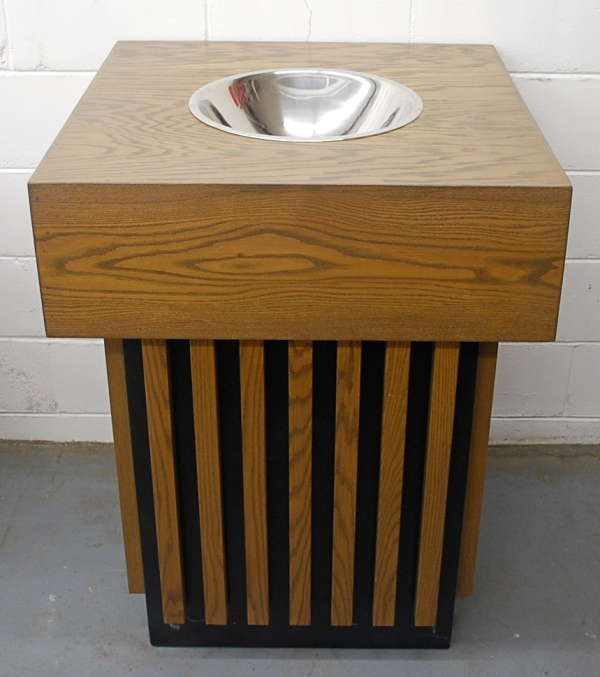 This is a used baptismal font that is 39" tall (not including the 8" cross) x 30" wide x 30" deep. The diameter of the stainless bowl 1s 15 1/2" This baptismal font has a wood structure with a wood top, and is in good condition with only a few nicks and scratches