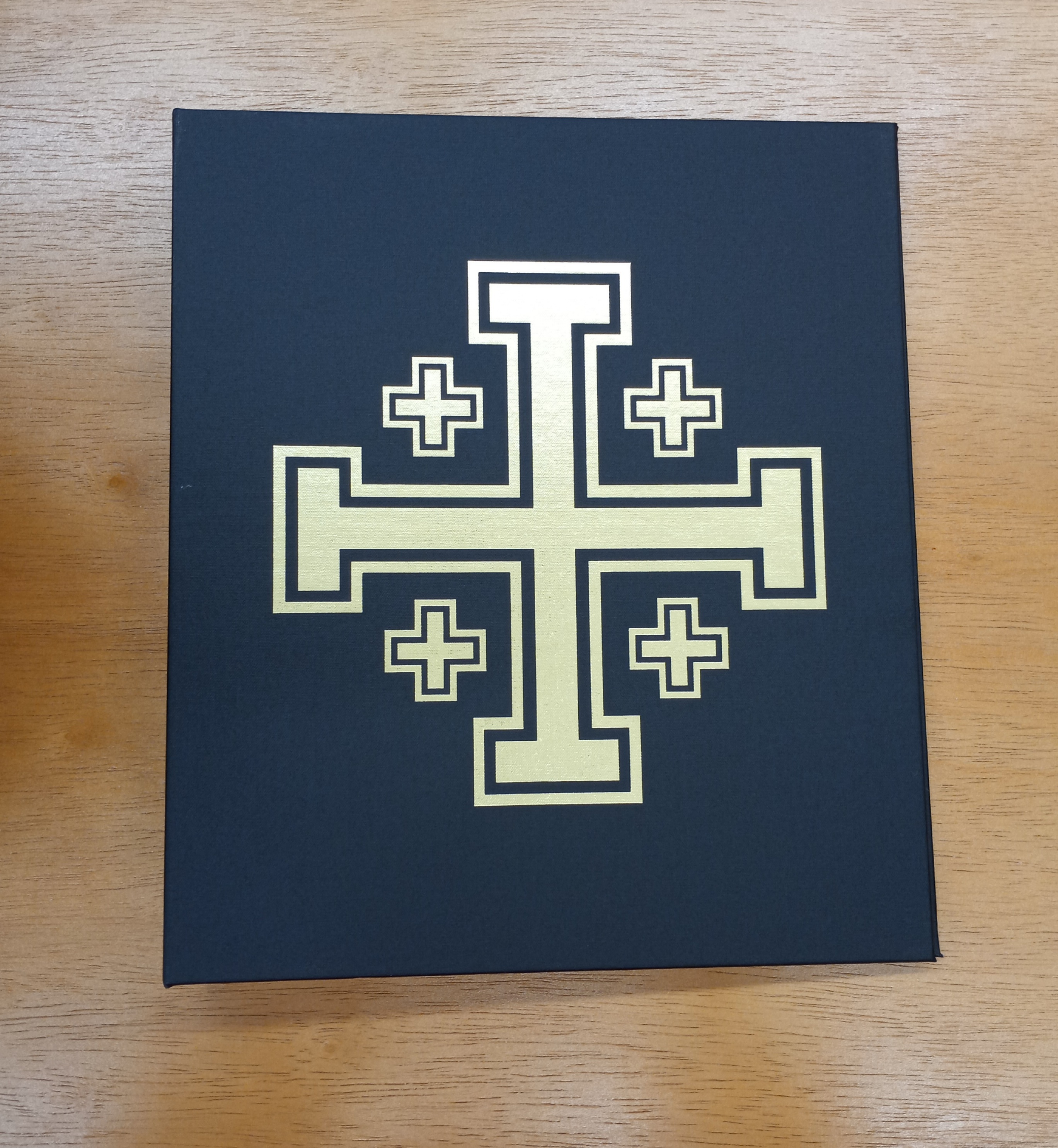 Clothbound ceremonial binder with 1.5" spine. Front, back and sides embossed with gold Jerusalem crosses. 2 vinyl inner pockets. Made in the U.S.A.