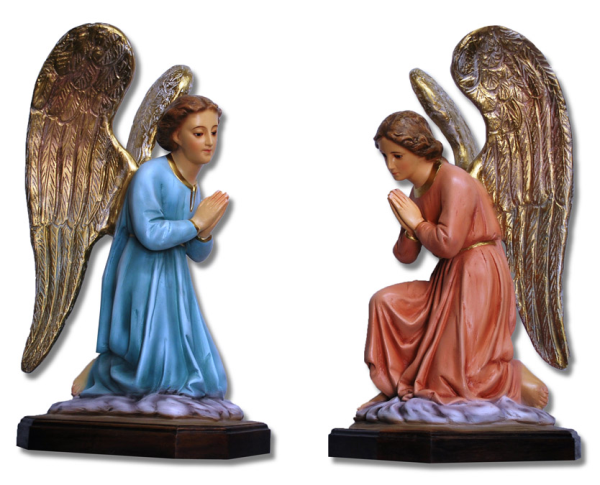 Available clothed in both white or full color gowns, these hand painted fiberglass Adoring Angels feature glass eyes and are made in South America. By Estatuario Religioso.
