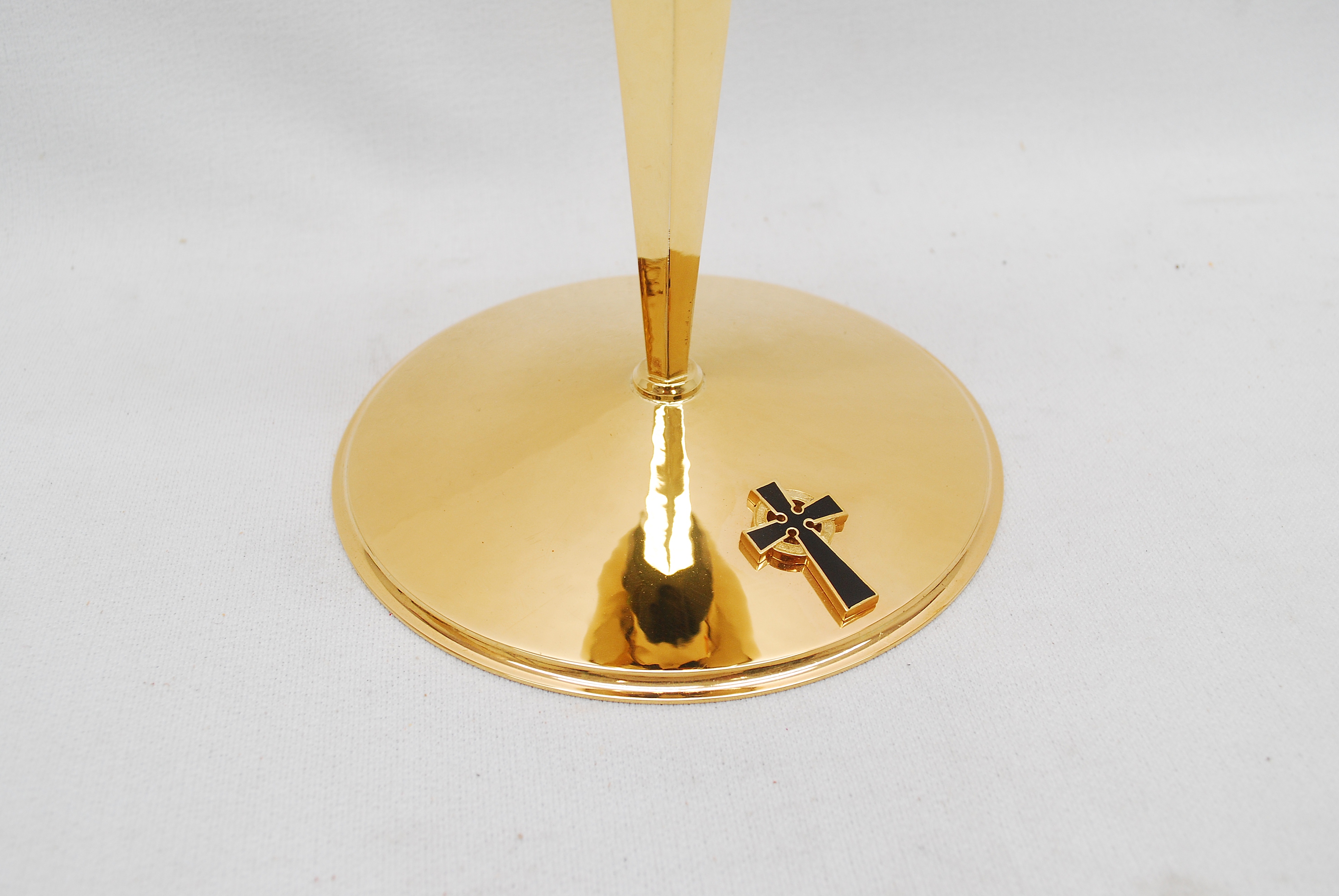 Gold Plated, Sterling Silver Chalice and Paten completely restored. Lightly hammered finish with tapered hexagon stem. Black Enameled Celtic base cross and Black Node. The scale Paten is 5-3/4” in diameter and has a raised base ring and a beautiful hand engraved Blessed Mother and Child. Chalice dimensions are 8-7/8” height, 4-1/4” cup dia., 6” base dia.. Base plate engraving dates this set from 1956. Made by Louis D. Hupfeld in Baltimore, MD.