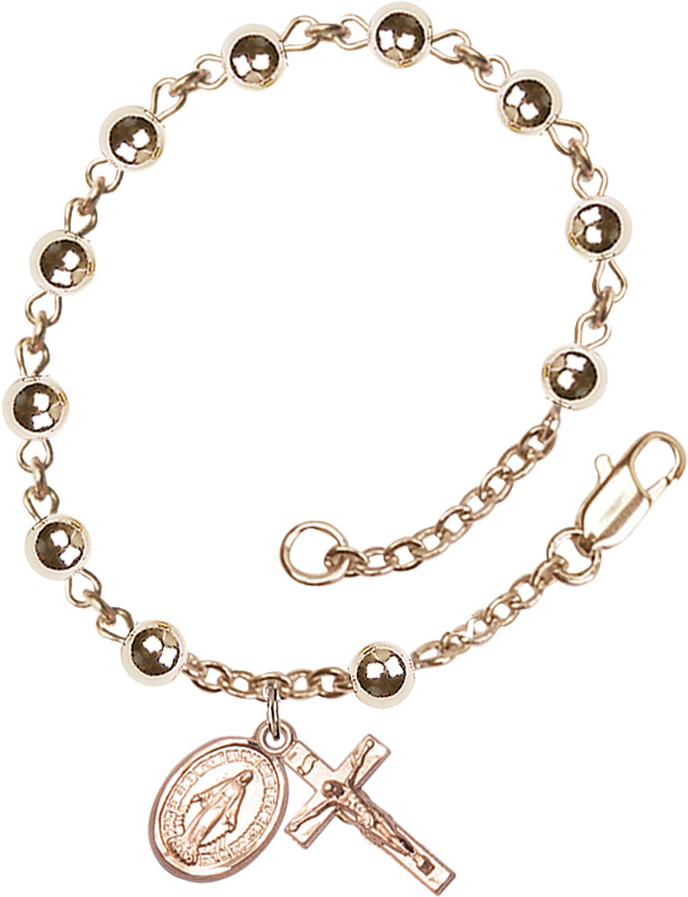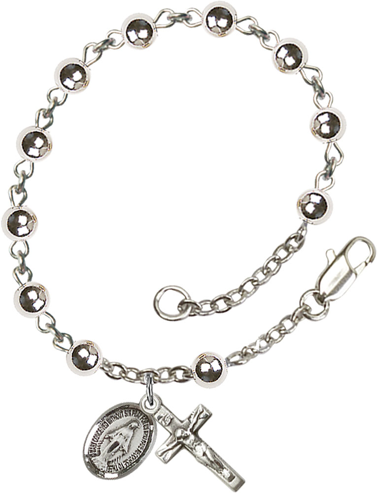 Rosary Bracelet features 5mm Mother of Pearl beads. The Crucifix measures 5/8 x 1/4.