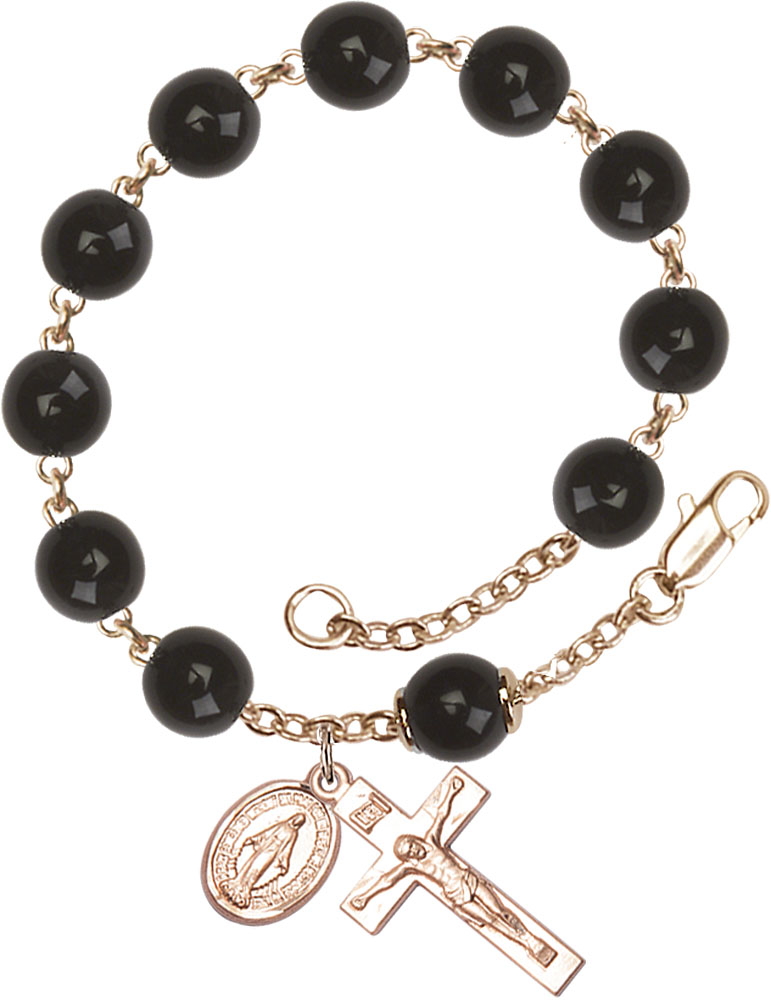 Rosary Bracelet features 8mm Black Capped Our Father beads. The Crucifix measures 7/8 x 3/8.