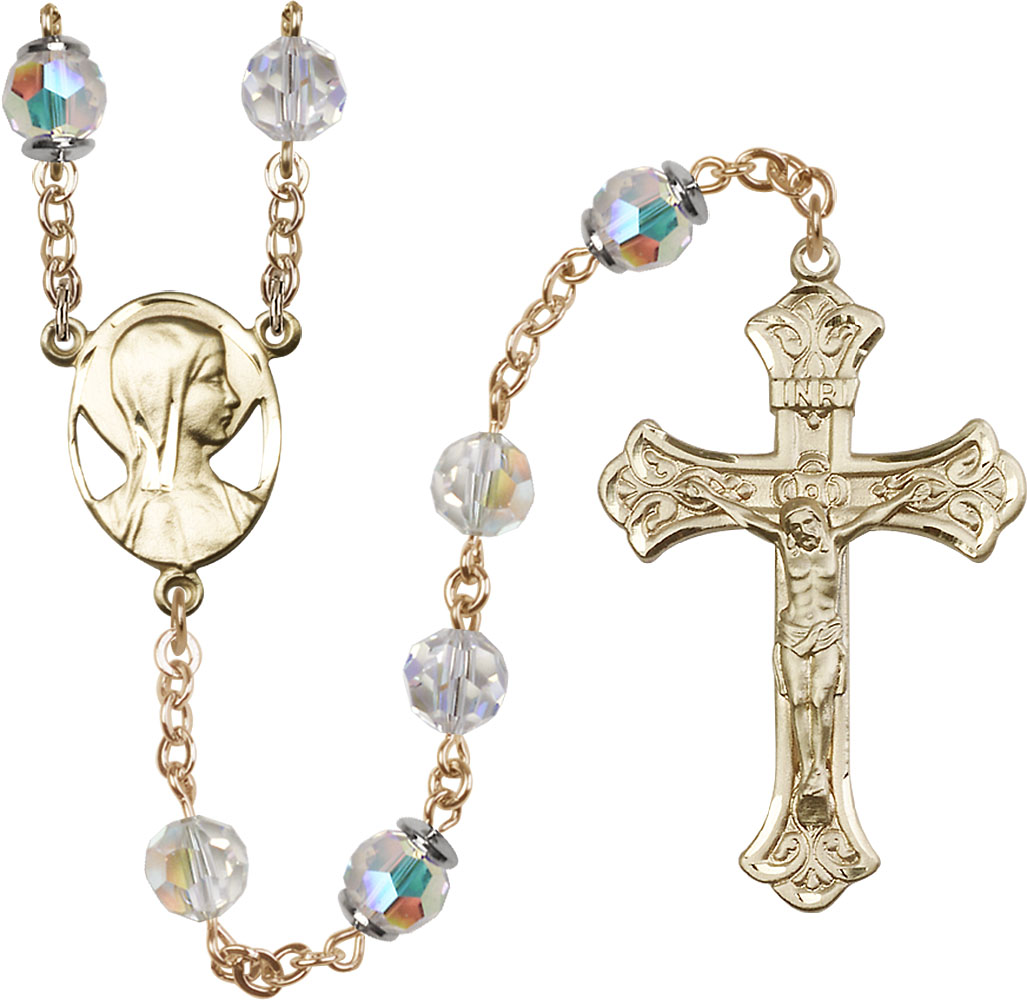 Rosary with 8mm Crystal Swarovski, Capped Our Father Aurora Borealis beads. 1 7/8 x 1 1/8 Crucifix. Novena medal centerpiece.
