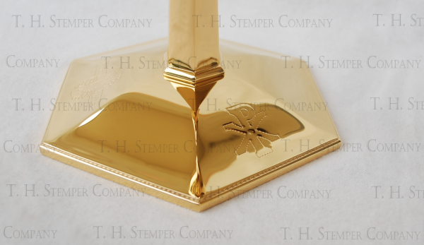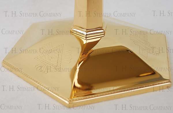 This is a restored 8" chalice. This chalice is all sterling and has been restored in 24kt. gold. The cup measures 4" in diameter, and the base has a 6" diameter. This chalice is accented by a hexagon base, stem, and node and has an art deco engraved design. I have included photos of the 3 symbols on the base as well.