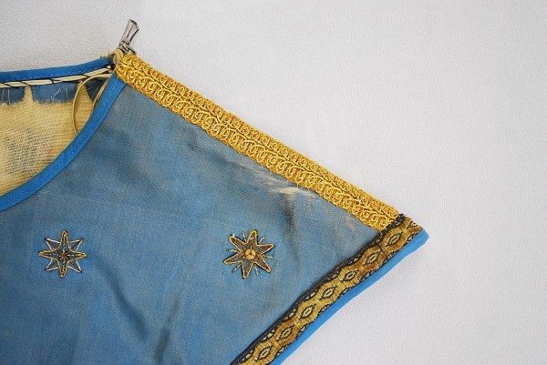 This is a previously owned, scapular style overlay stole. This antique stole, is hand embroidered in gold metallic, and edged with gold brocade banding on both sides. I have included an extra photo, that shows the age of the fabric and some of the wear that you will find on this stole. Extra photos can be provided upon request.