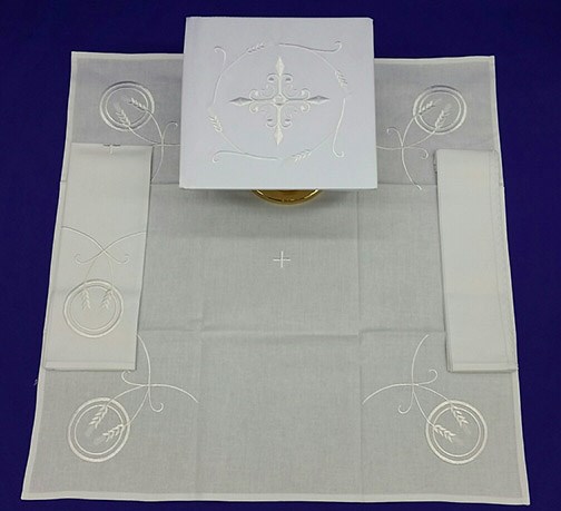 Beautiful white embroidery featuring a Cross and Wheat. 100% Cotton Mass Linen set. Includes a 7" x 7" chalice pall with a removeable insert, a 20" x 20" corporal and a 10.5"  x 20.5" purificator.  Includes a 10.75" x 21" unembroidered finger towel.