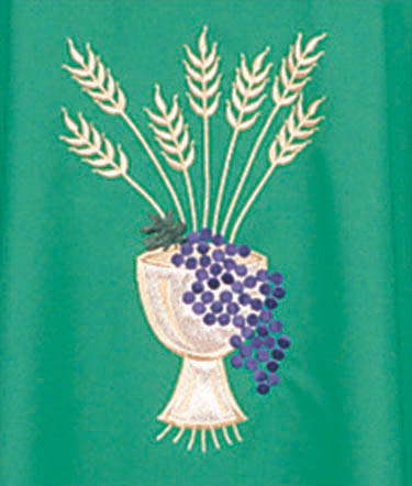 Our polyester chasubles are wrinkle resistant and lightweight, making them ideal for regular use. This chasuble features a beautiful chalice and grape design overlaying a group of embroidered wheat stalks. This chasuble is available in eight colors to celebrate every liturgical season and sacrament, and has 3 1/2" roll collar option.