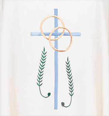 T.H. Stemper sells a wide range of liturgical vestments for a range of special events, like this wedding chasuble. It features an embroidered design of a pair of rings positioned in front of a light blue cross with olive branches on each side of the cross. The chasuble is made from lightweight and breathable polyester, which is wrinkle resistant and comes in eight different colors. It also features options such as front and back embroidery and a 3 1/2" collar.