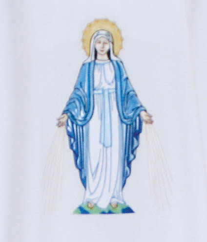 This Beau Veste chasuble is made from textured fortel and features a beutifully embroidered image of Our Lady. They made from 100% lightweight polyester that is wrinkle, tear and crease resistent, but has a linen like look. 8 colors are available; white, off-white, red, purple, kelly green, hunter green, blue and rose. Beau Veste chasubles are one size fits all (52" back length, 60" width at the "sleeve." 3.5" roll collars are available upon request for a amall additional charge. This chasuble can be embroidered on the back as well for an additional fee.