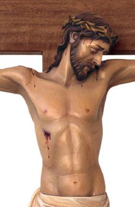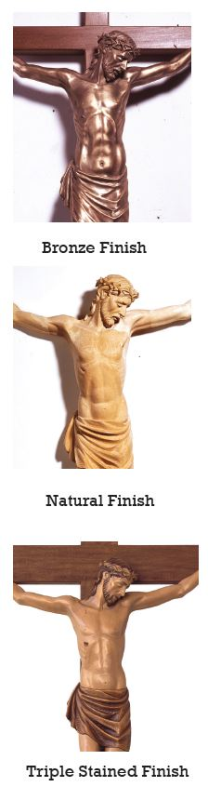 The "A. De Luca Bandini" is available in a 4' corpus with an 8' overall cross size. It can be cast in fiberglass or hand carved in lindenwood - painted or stained in various styles. Marble, bronze, aluminum, mosaic and custom size options are also available (please inquire).