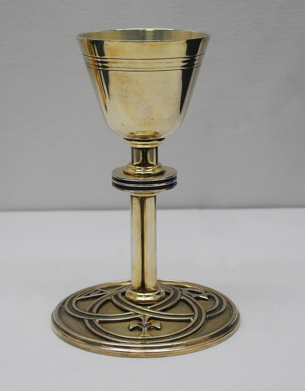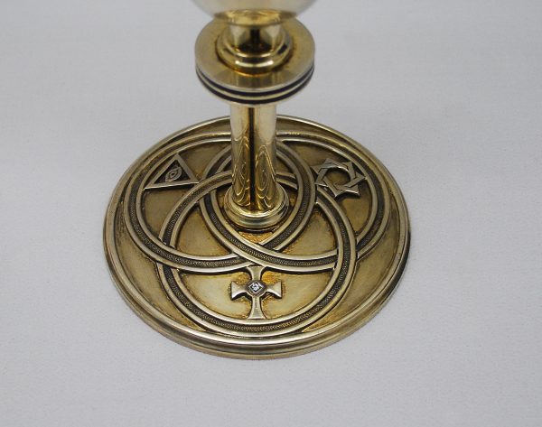 This is a previously used chalice that is 8 1/4" tall. It is a sterling chalice with the trinity symbol on the base. There is a diamond in the base cross as well. The scale paten is 5 3/8" in diameter and is also sterling silver. The case will be included in the sale.