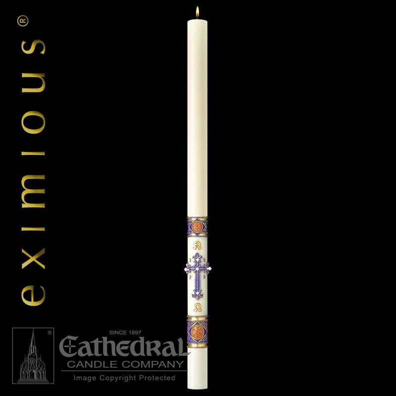 The Lilium Eximious Paschal Candle from T. H. Stemper is handcrafted and beautiful. The hand-carved Fleur de Lis cross is an eye-catching and ancient symbol for the Holy Trinity. Executed regally in blue and gold. Ornamental bands contain bronze-toned Agnus Dei medallions and Chi Rho monograms, the date (year) and Alpha and Omega adorn the front of the candle in gold.