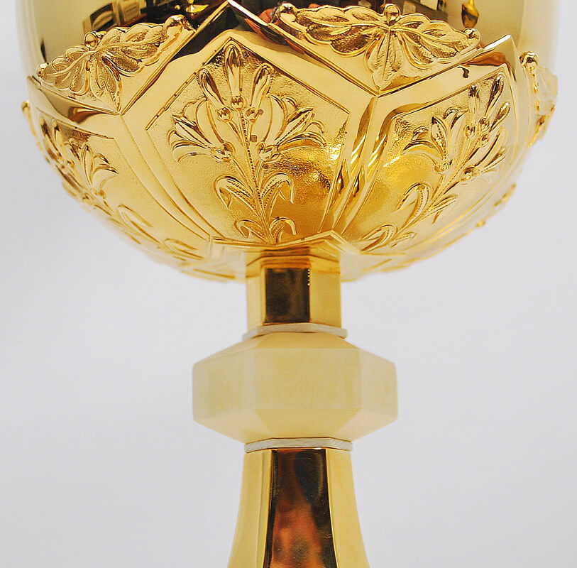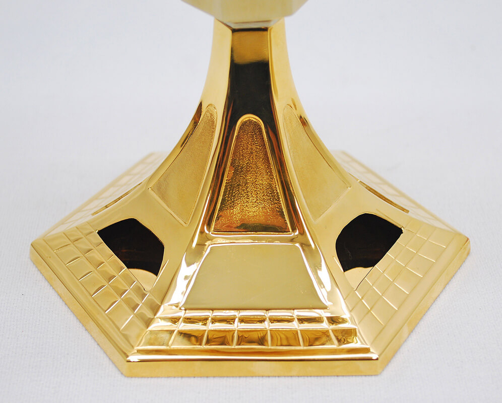 This is a previously used 800/1000 silver Chalice that is 8" tall. It has a nice decorative calyx and a stone node. The 6" paten is included in the sale. This item is in good usable condition and would not need any restoration.