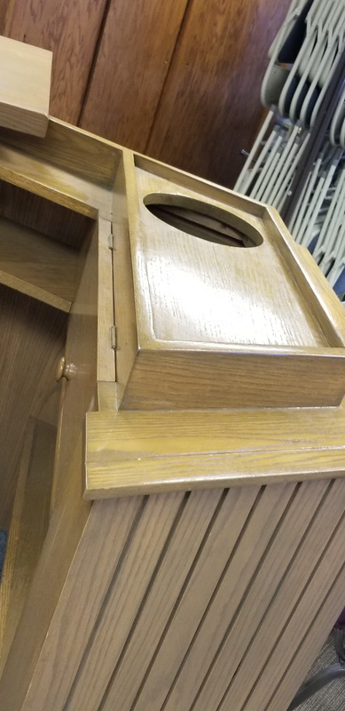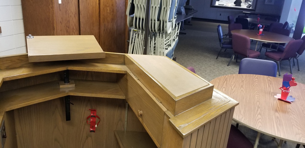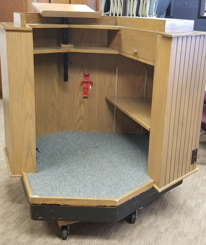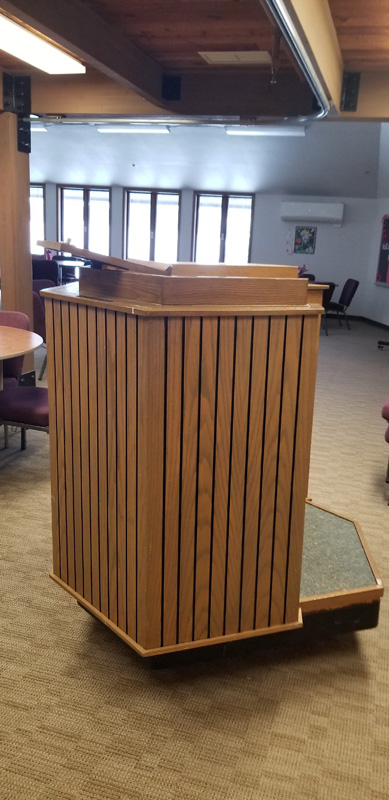 This is a previously used wood pulpit. It is 45" tall x 60" wide x 40" deep. It does have an adjustable book rest, and a handy storage area and shelves. This pulpit is ready for use.
