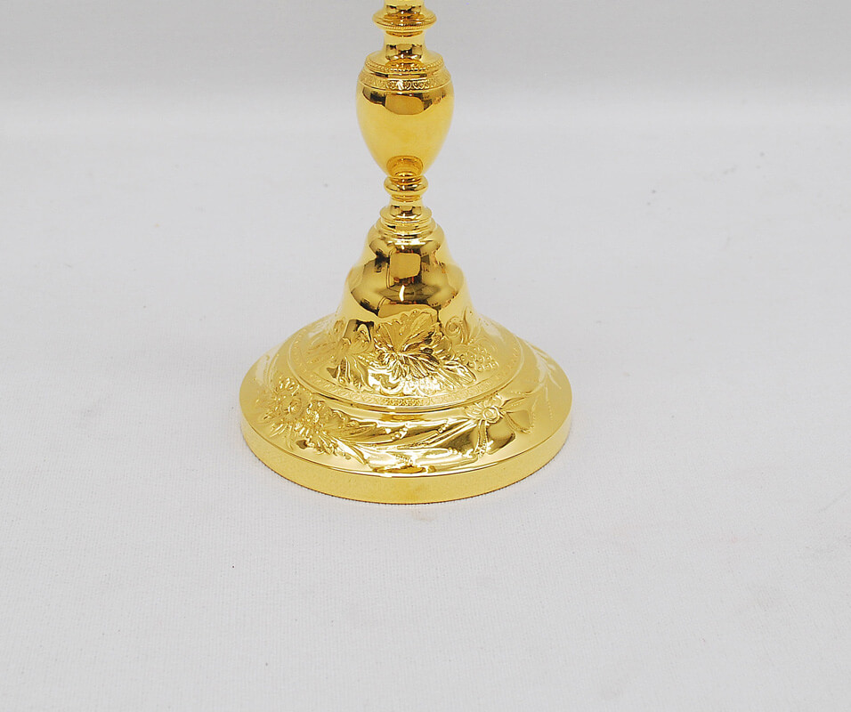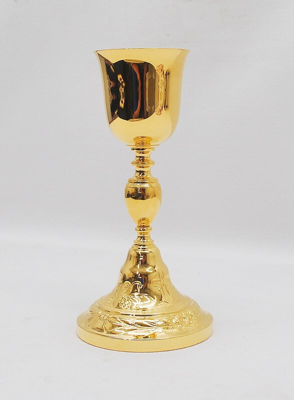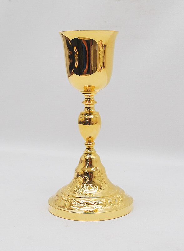 This Chalice has been restored in 24kt. gold plate. It is 8 5/8" tall with a cup diameter of 2 7/8" and a base diameter of 4 1/4"