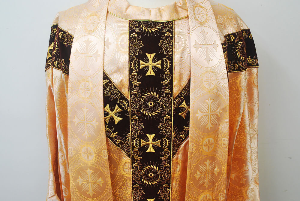 This is a previously owned chasuble set. This item will come with a matching stole. This set is in good condition. Please not that we have 5 colors of chasubles that have a matching base fabric. Please see the other listings for those chasuble sets.