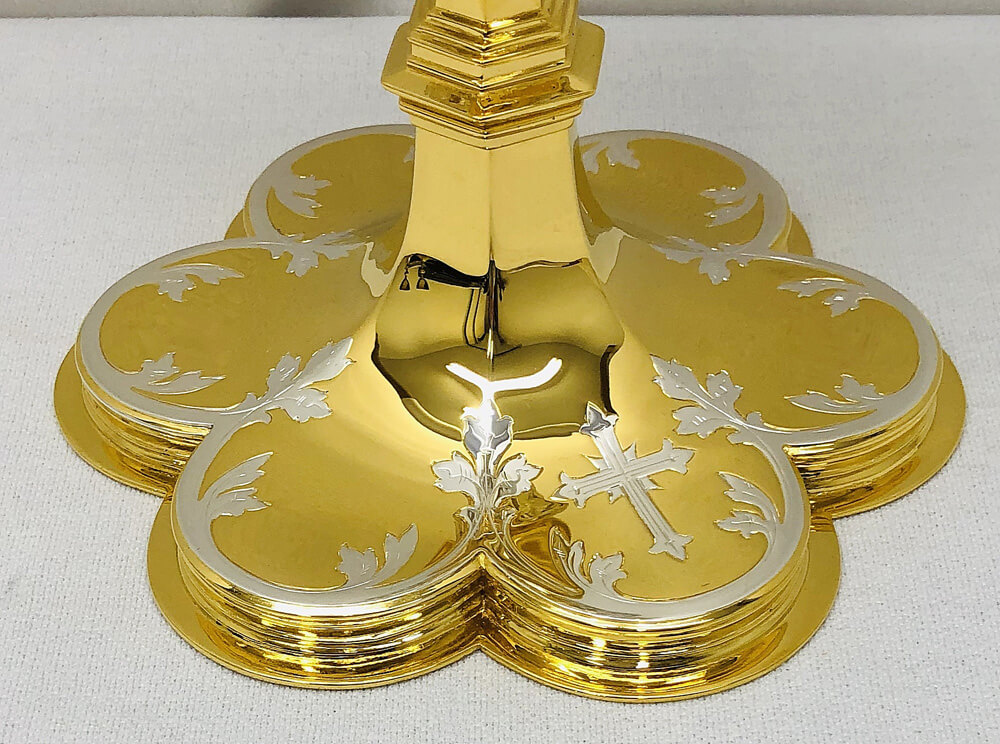 This is a restored 800/1000 silver Chalice. It has been artistically restored in high polish 24kt gold plate with silver accents. It is 8 5/8" tall and features a filigree cup calyx, and node. The cup diameter is 4 1/4" and the base is 6 3/8" Made in Germany. This item is now SOLD.