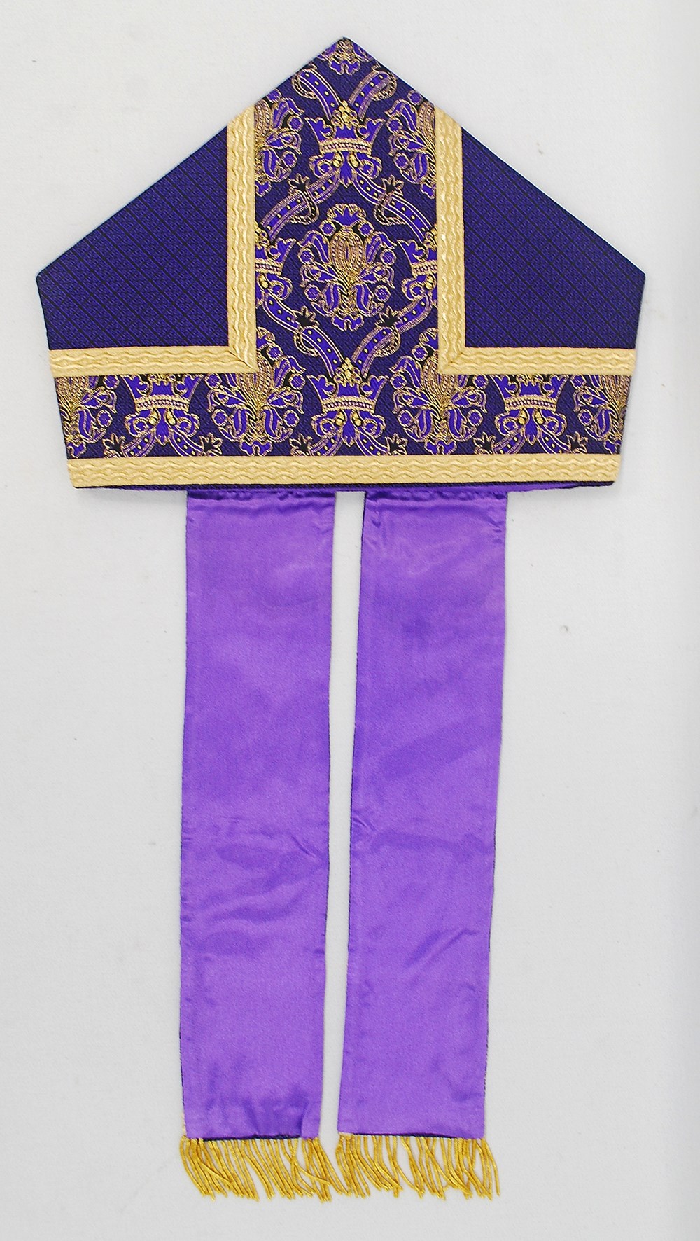 This is a previously owned Bishops Mitre that is in excellent condition. This Mitre is in blue-purple from the Solomon Collection by Gaspard Inc. Regular retail price is $576.00
