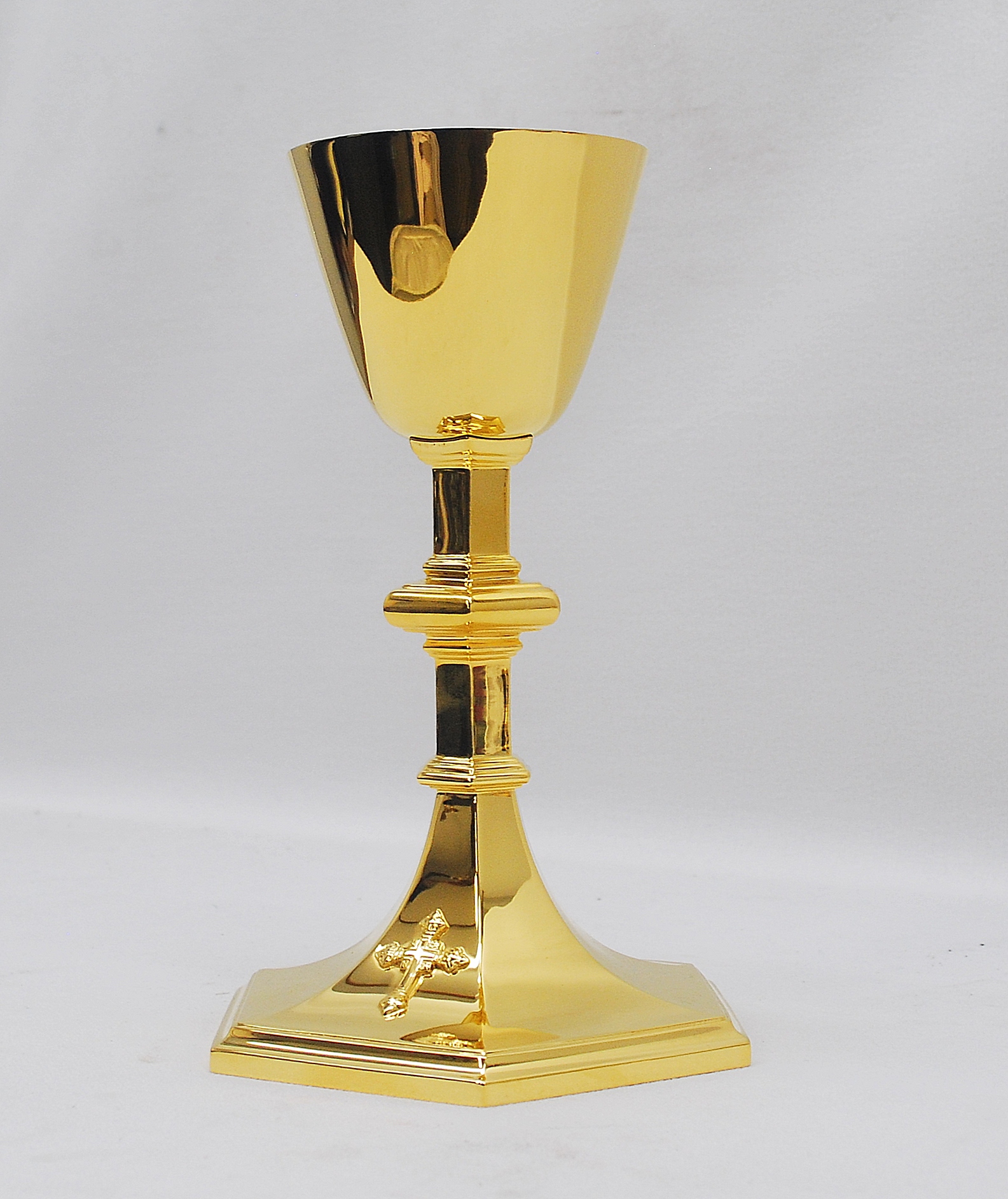 This is a restored sterling Chalice.  The Chalice is 9" tall and has a gold plate high polish finish.  This chalice has a nice heavy construction. This Chalice has been SOLD.