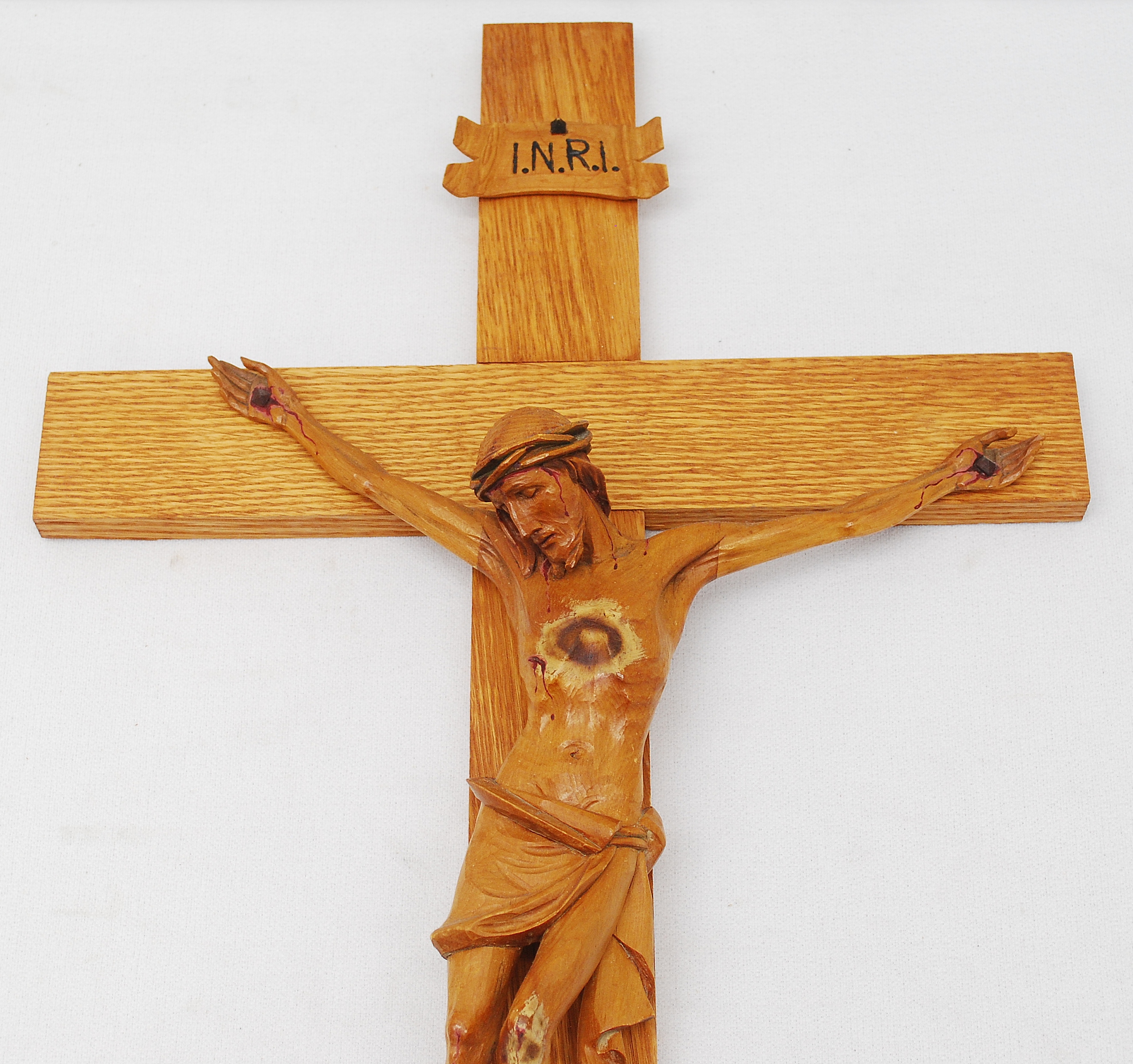This is a previously owned 28" wood carved crucifix. It has a wood cross with a wood carved corpus and is in good condition.
