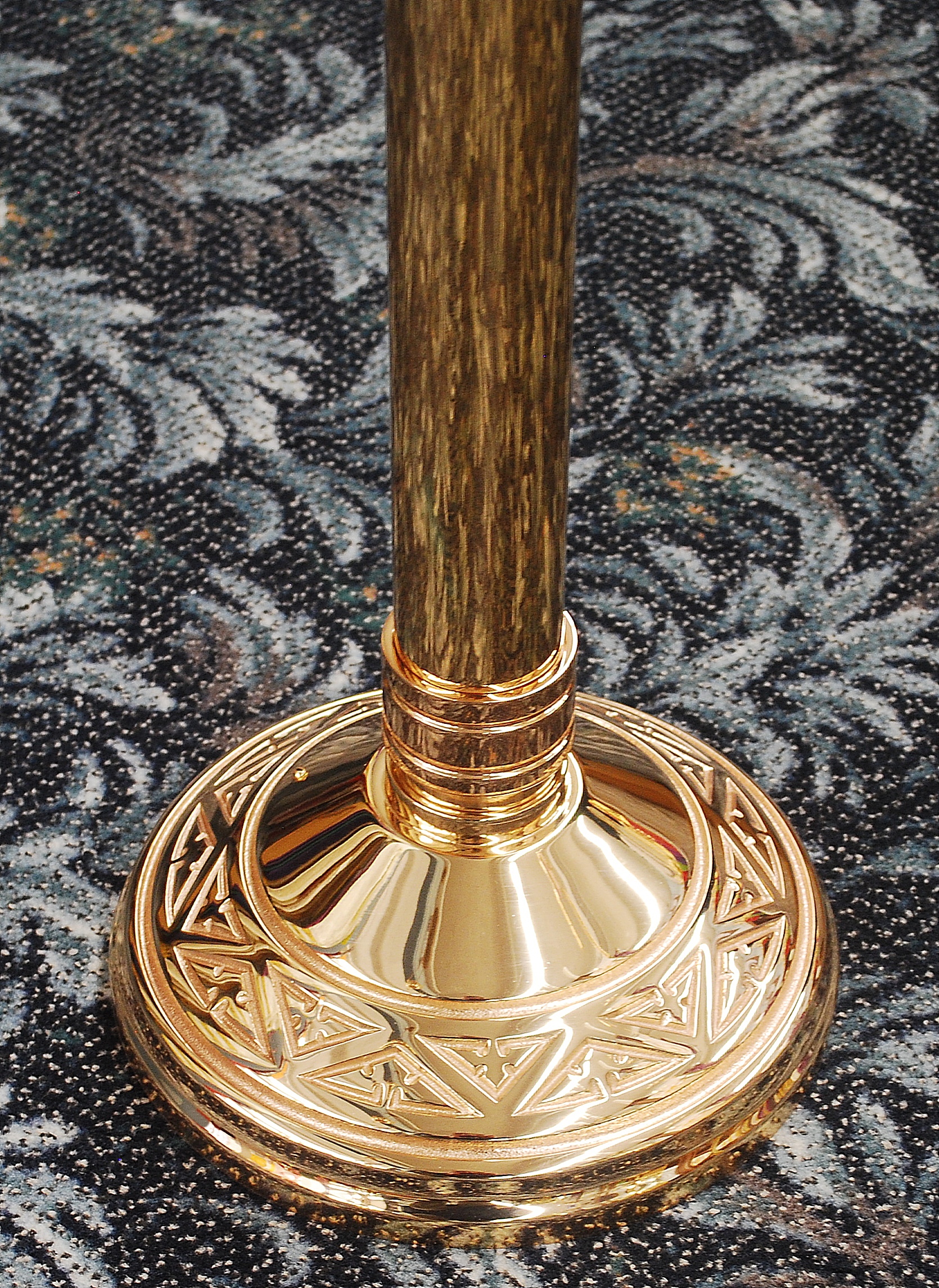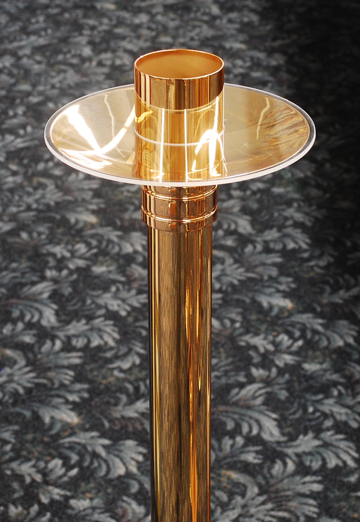 This is a restored paschal candlestick.  It is 45" tall with a 2" socket and has a high polish bronze finish. It has a nice heavy construction to hold your Easter candle.  Please note we can fit this candlestick with virtually any size socket to fit your needs.  Please send us an email or give us a call if you have any questions.  This candlestick sells new for $1,325.00  This item is now SOLD.