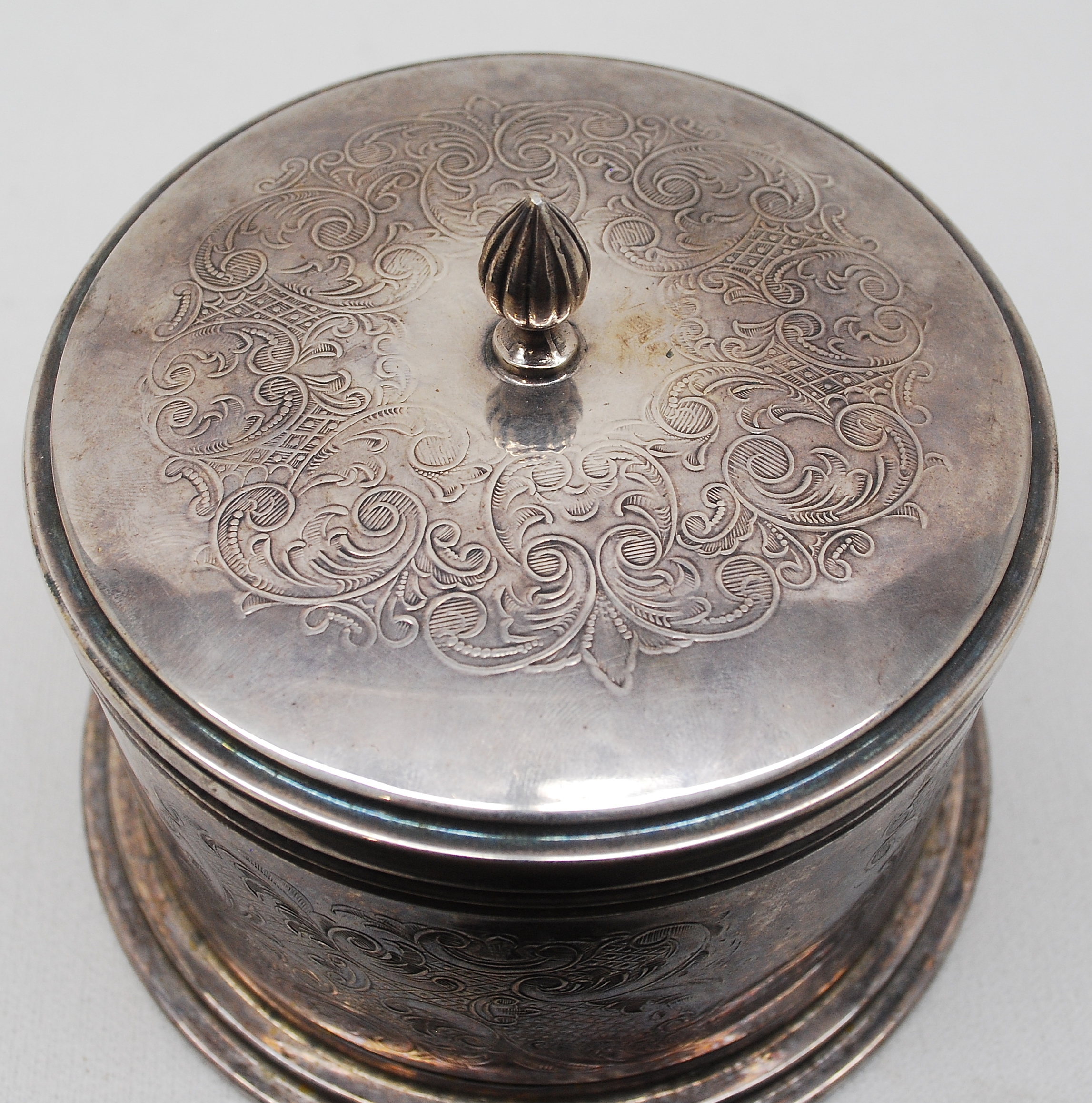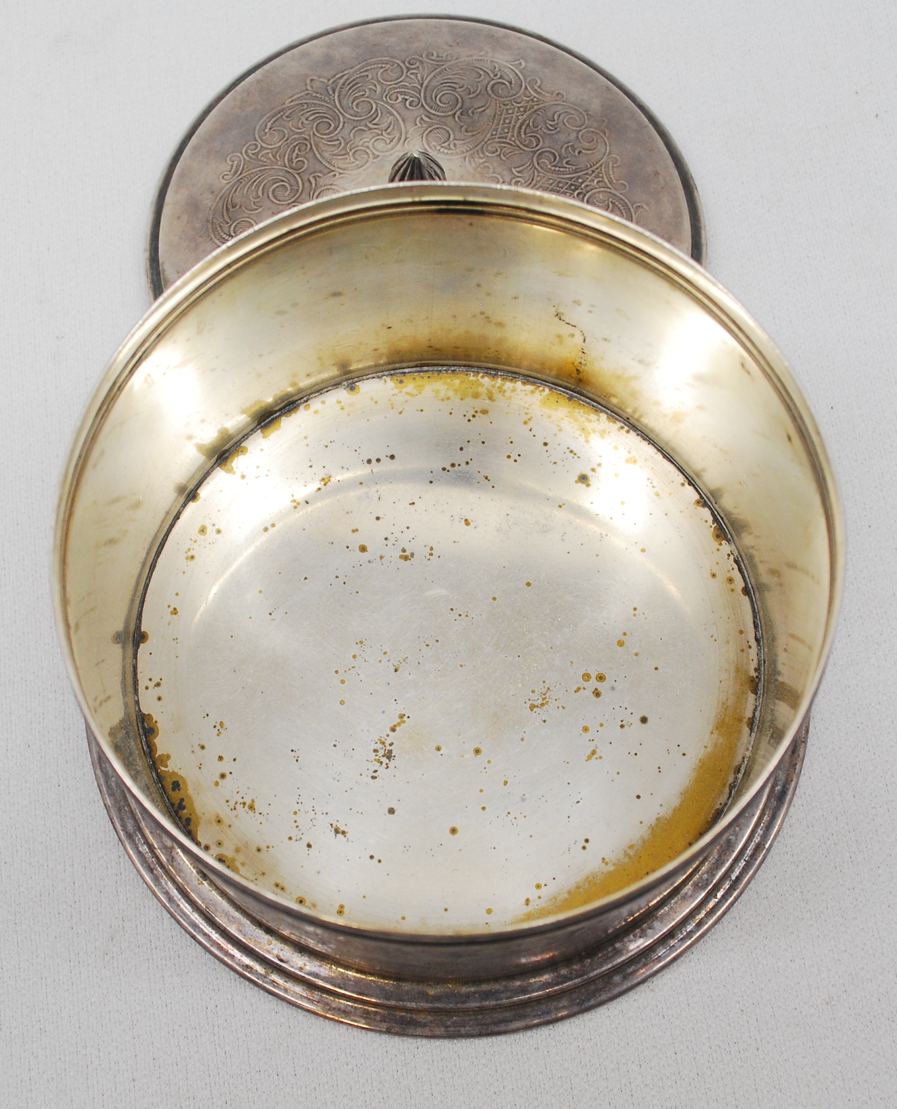 This is a previously used silver plate host container. It is 4" tall with a 4 7/8" diameter and is in good usable condition.