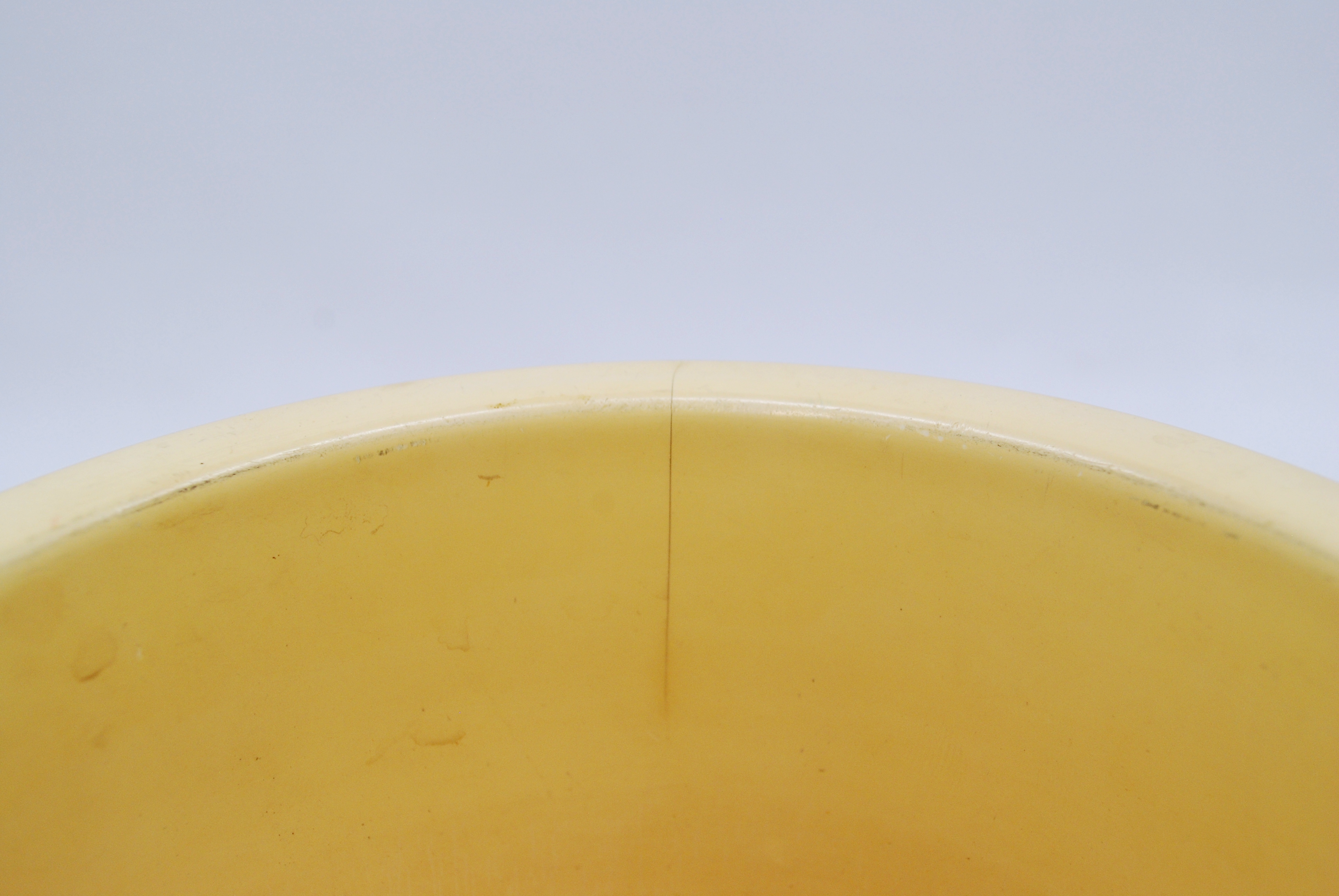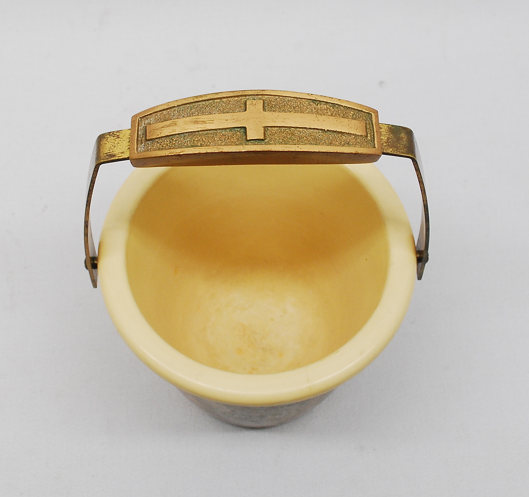 This is a previously used bronze Holy Water pot. It is 5" tall with a 6" diameter and is in good usable condition. Please note that there is a photo showing a crack in the plastic liner. This crack should be repaired with 2-part Epoxy or equivalent.