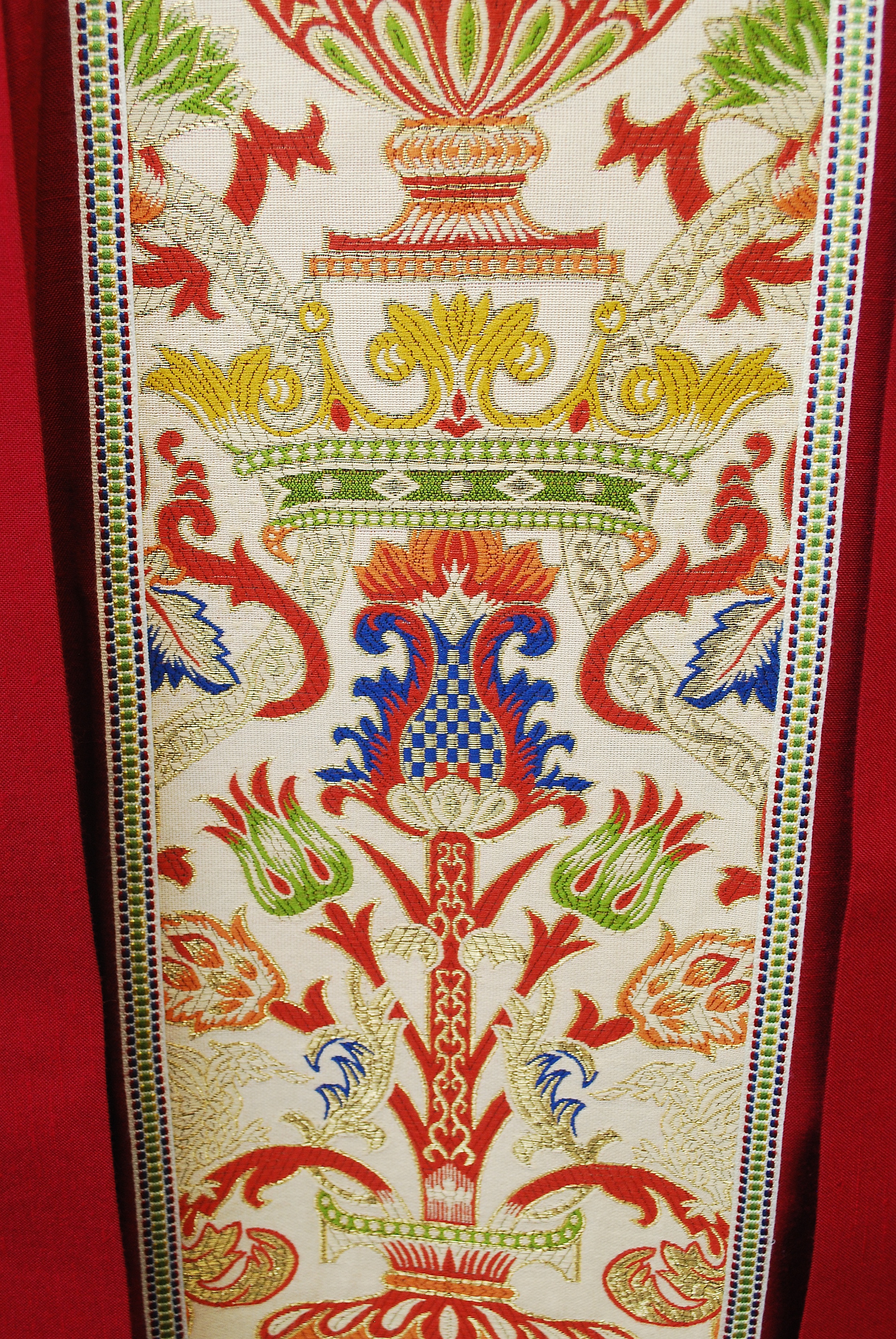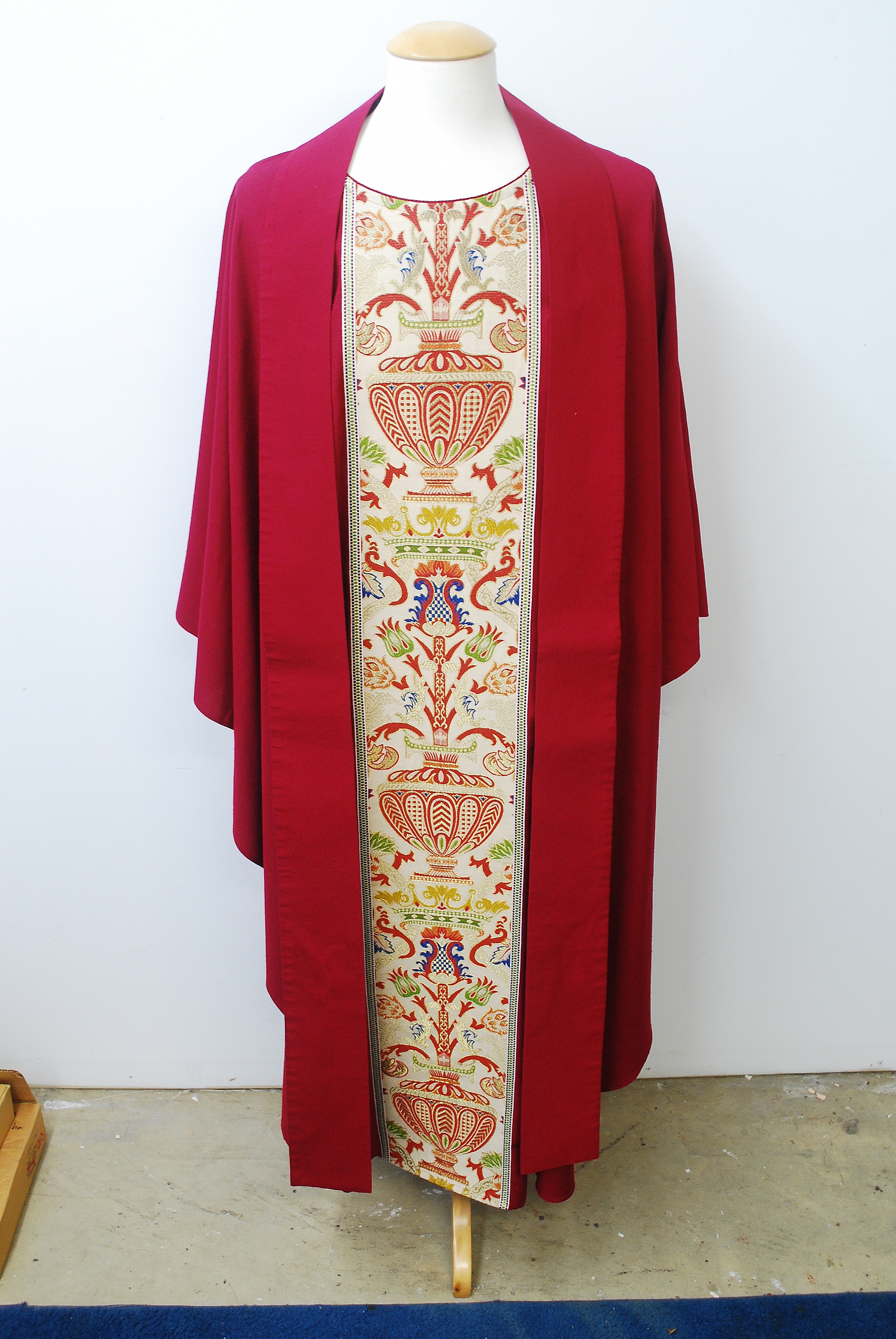 This is a plain neck chasuble in Dupion fabric with red accented Regina Orphreys. The matching stole is included. This item was lightly used and is in good condition.