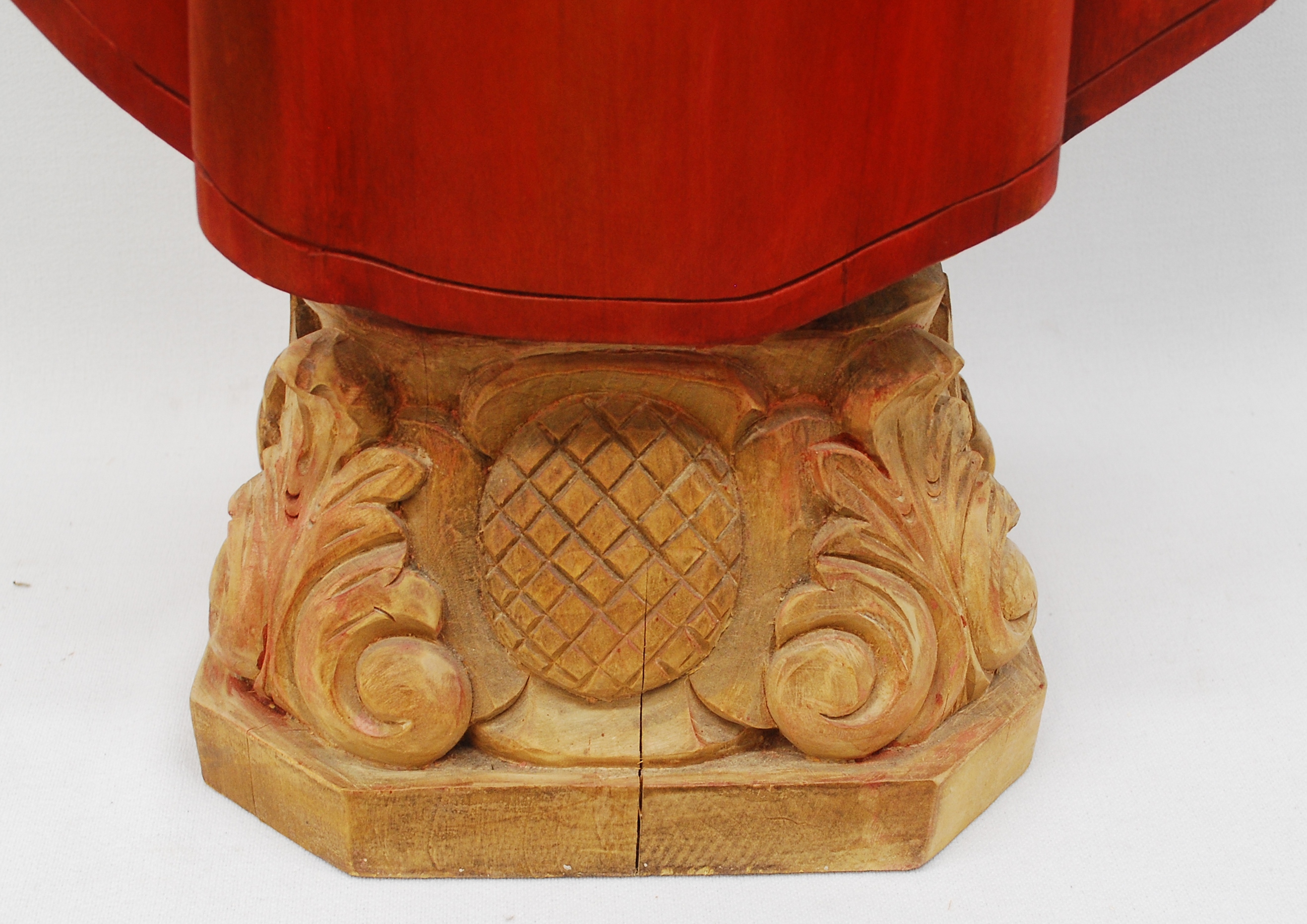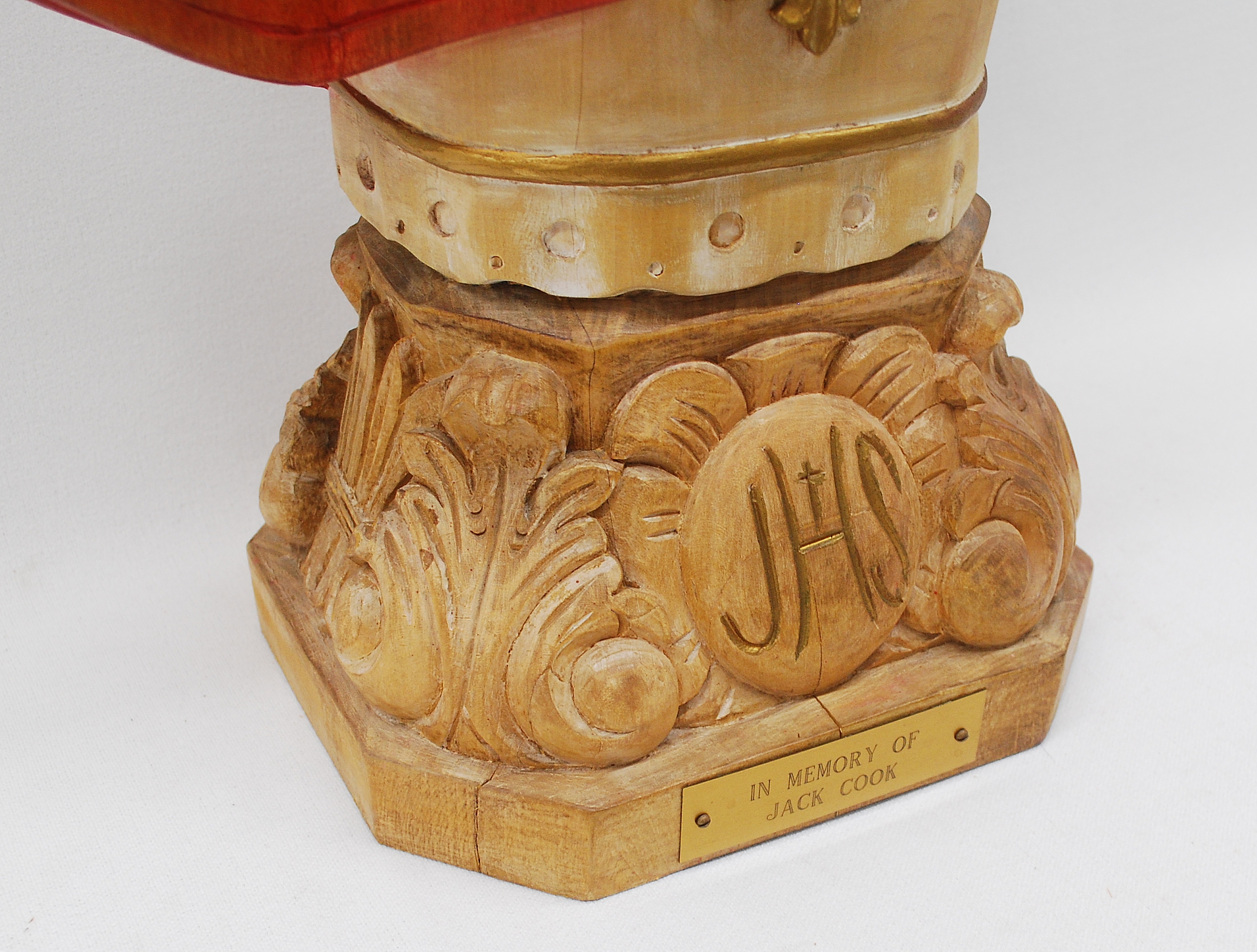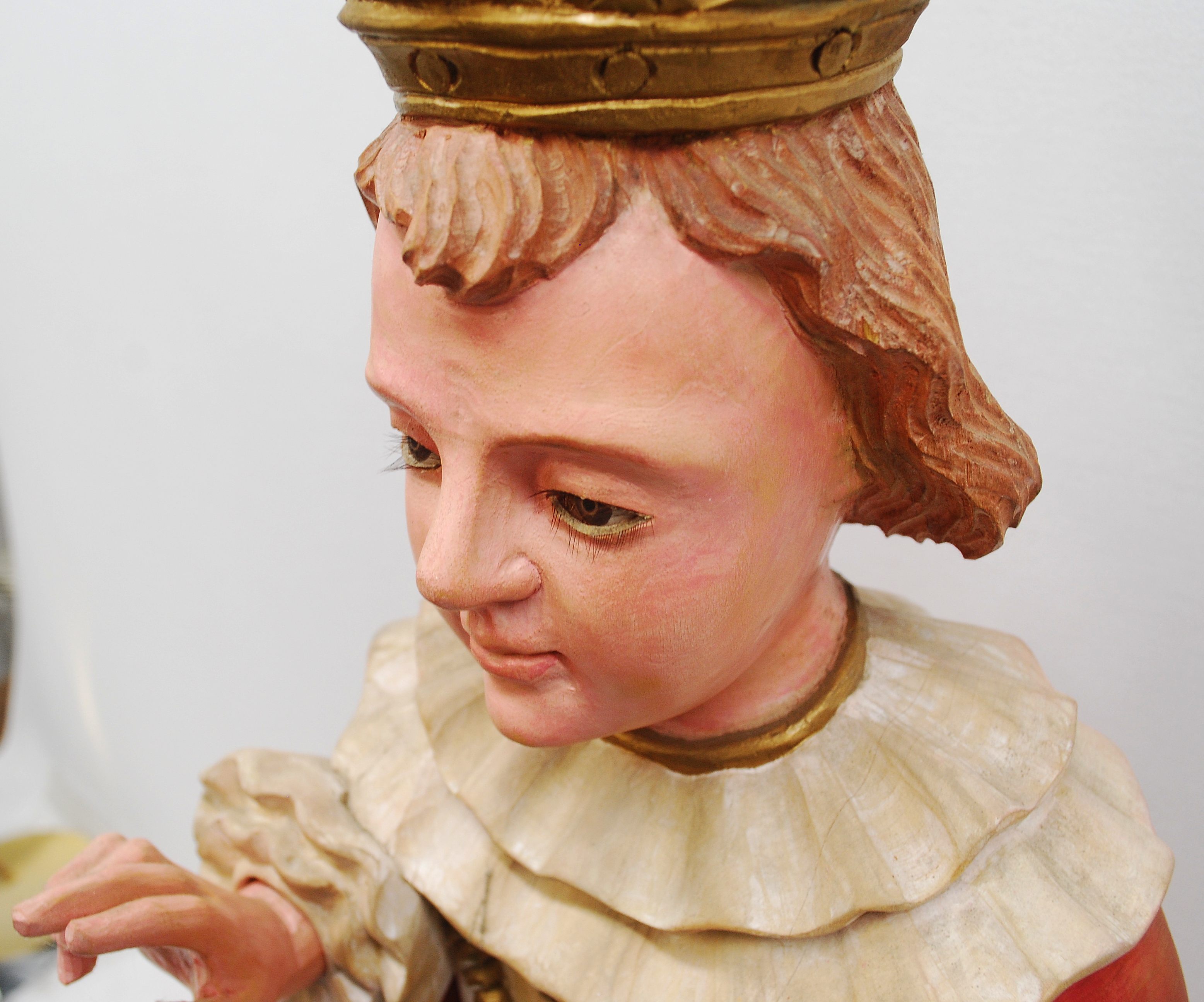 This is a previously owned wood carved Infant Of Prague. It is 32 1/2" tall and is in good usable condition. Please see the photos for a few cracks in the wood.