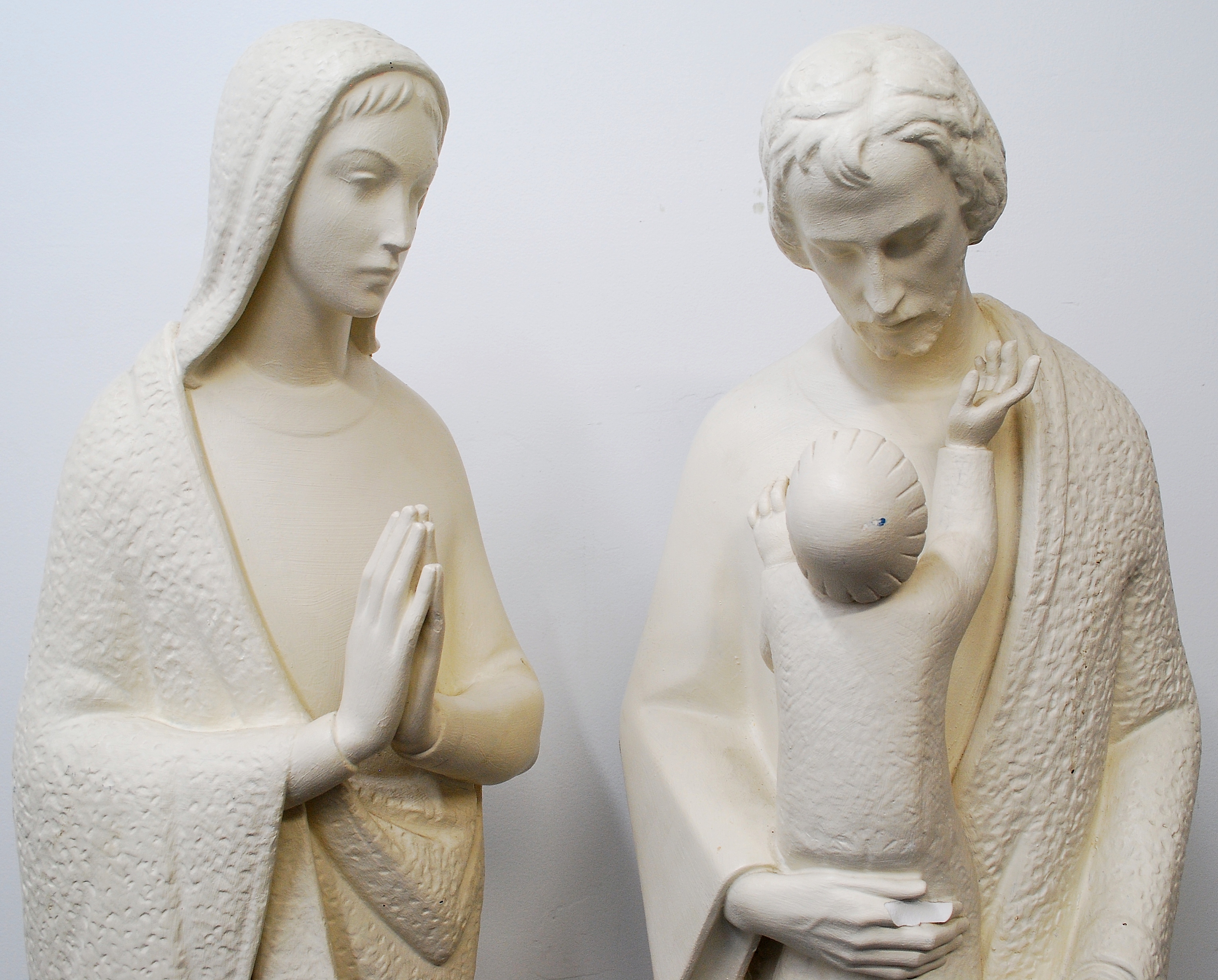 This is a previously owned statue of the Holy Family. It is 48" tall and is made out of plaster. There is damage to one of Josephs fingers that could use repair. Other than that, these are in good condition.