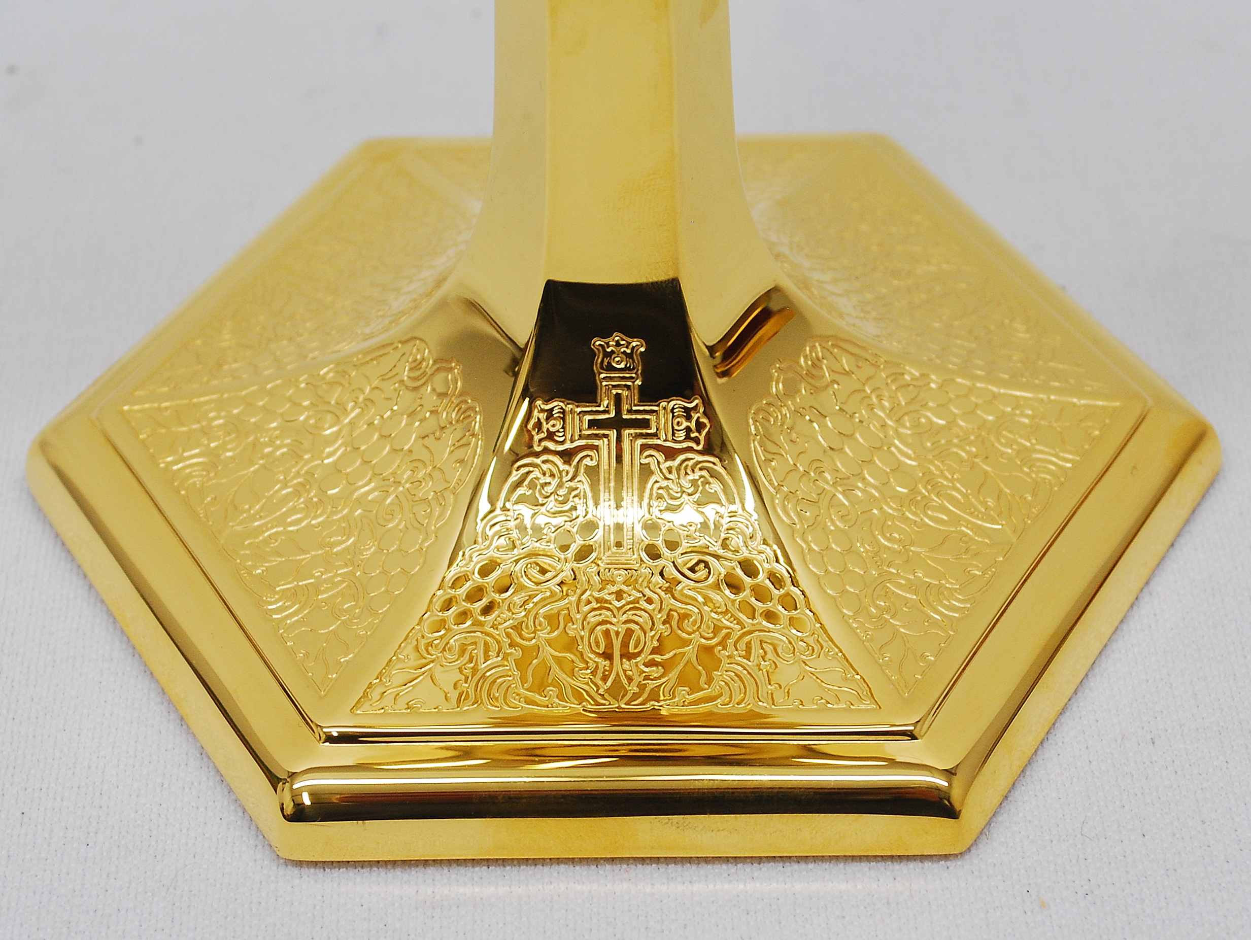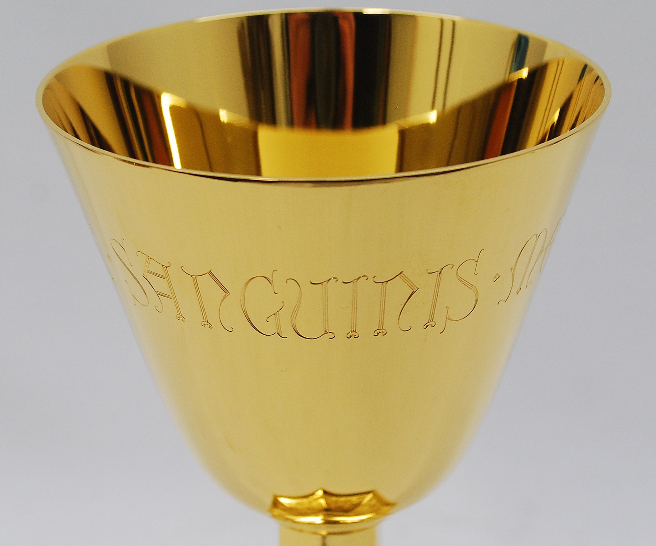 This is a restored 8 3/4" sterling Chalice. It has a crown of thorns design on the node and an embossed grape design on the base. The cup features a Latin engraving HIC EST ENIM CALIX SANGUINIS MEI ( for this is my blood ) ***SOLD***