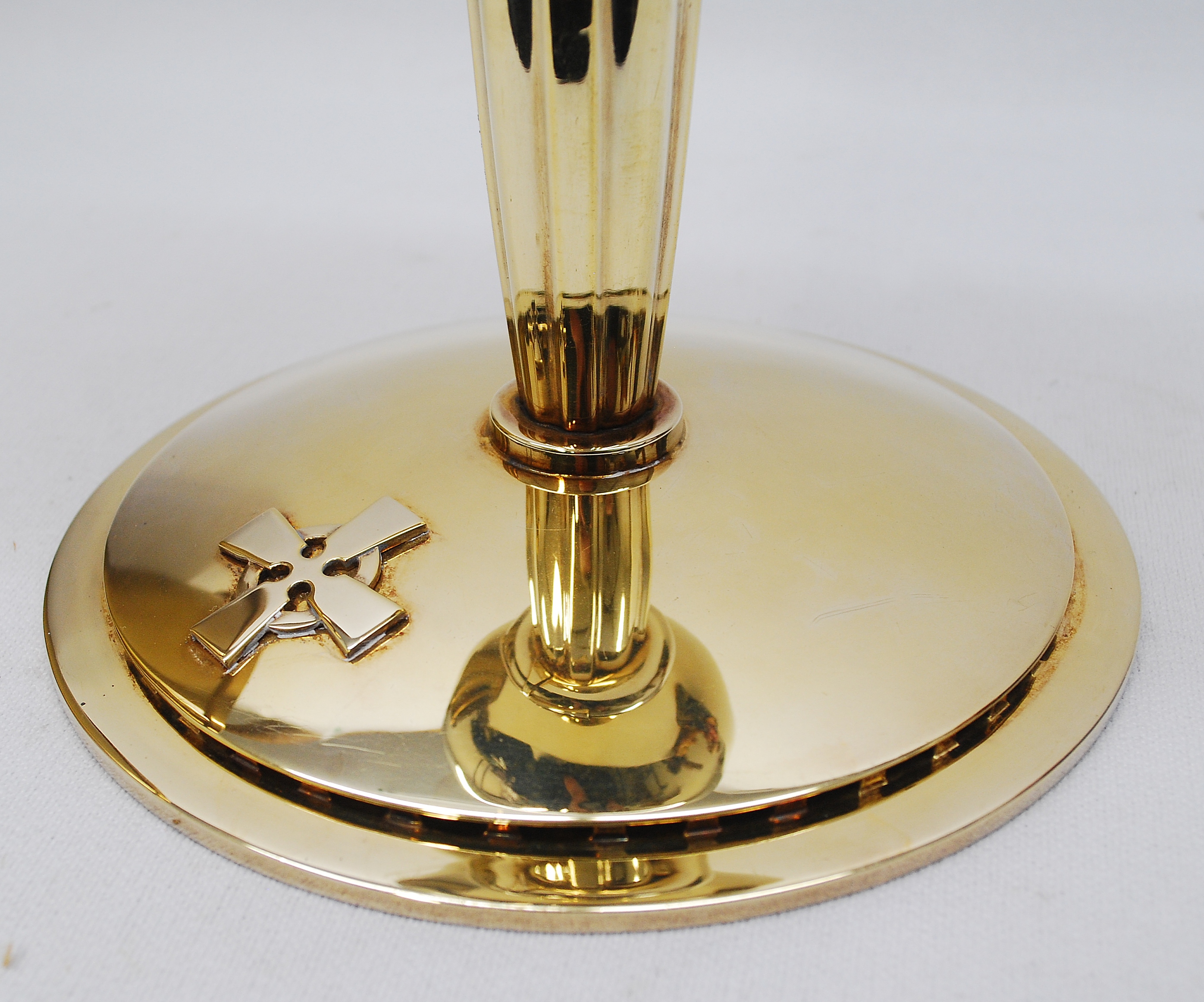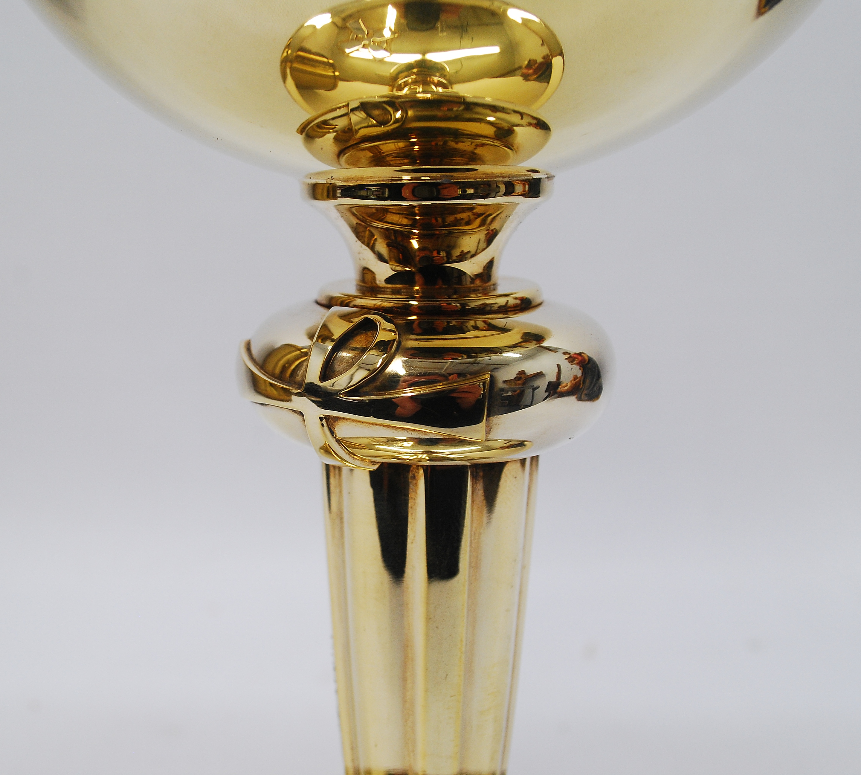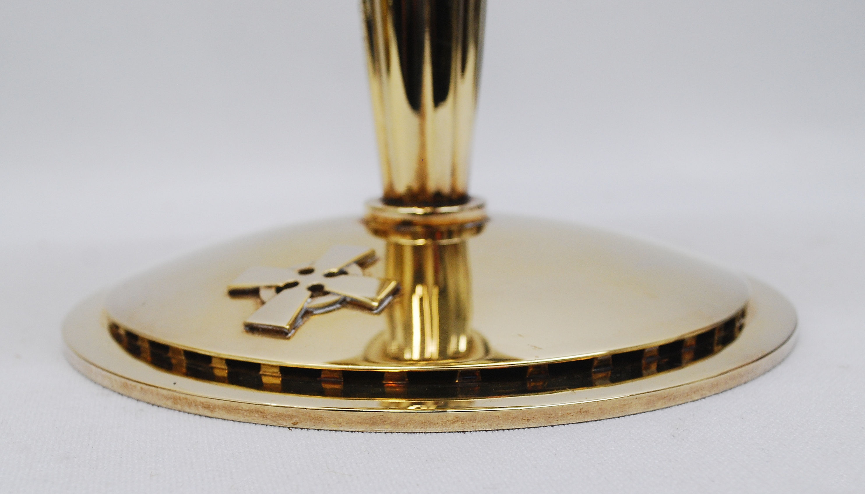 This is a previously used sterling Chalice. It is 8 1/2" tall and is made out of sterling silver with gold plate. It has a 6 3/8" base diameter with a 5" diameter cup. This item is in good condition.