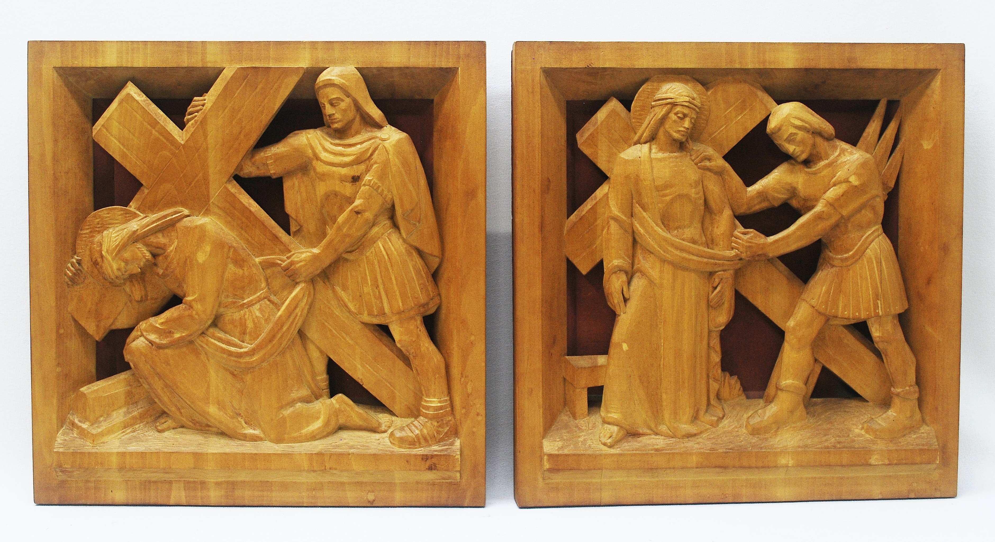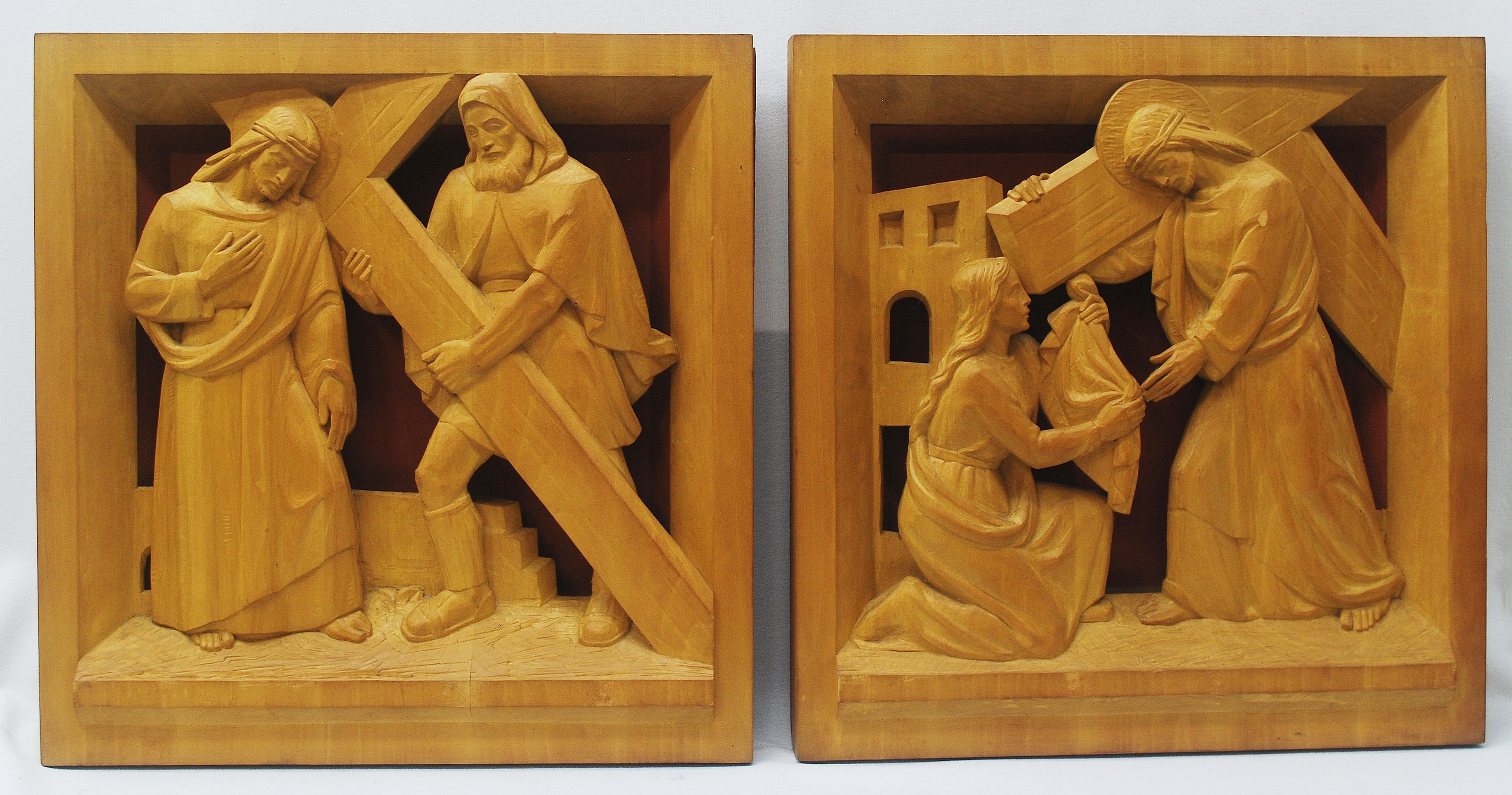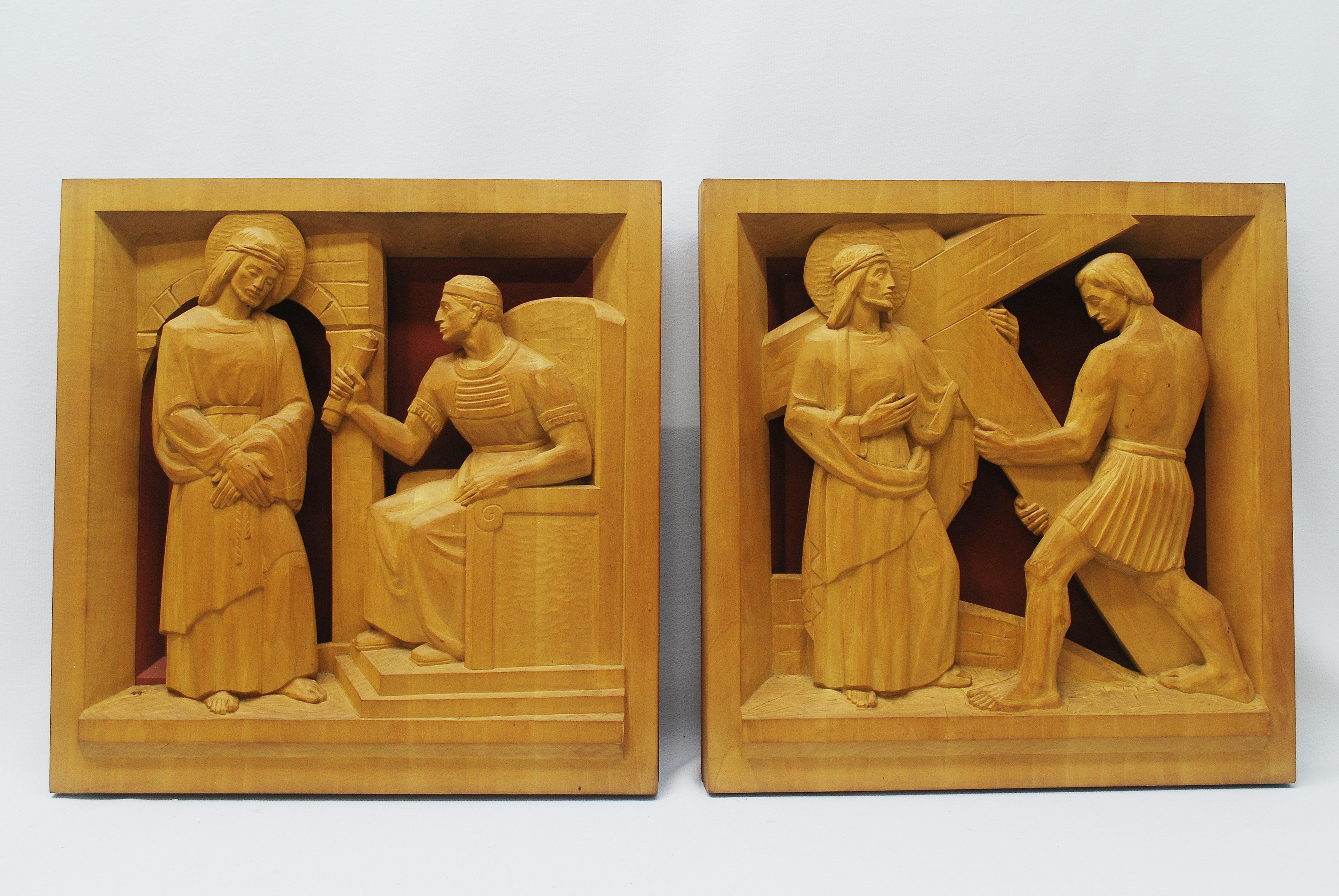 These are previously owned Stations Of the Cross. They are Woodcarved and measure 14 1/2" x 24 3/4". Please pay attention to the images as there are a few splits in some of the stations.