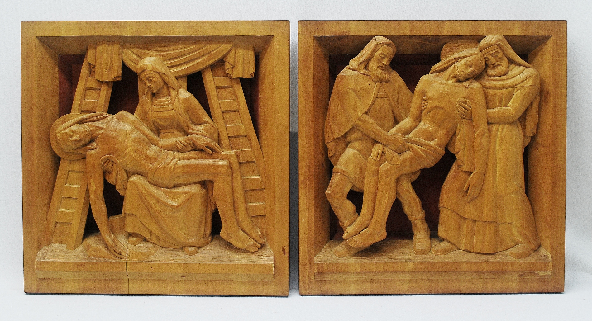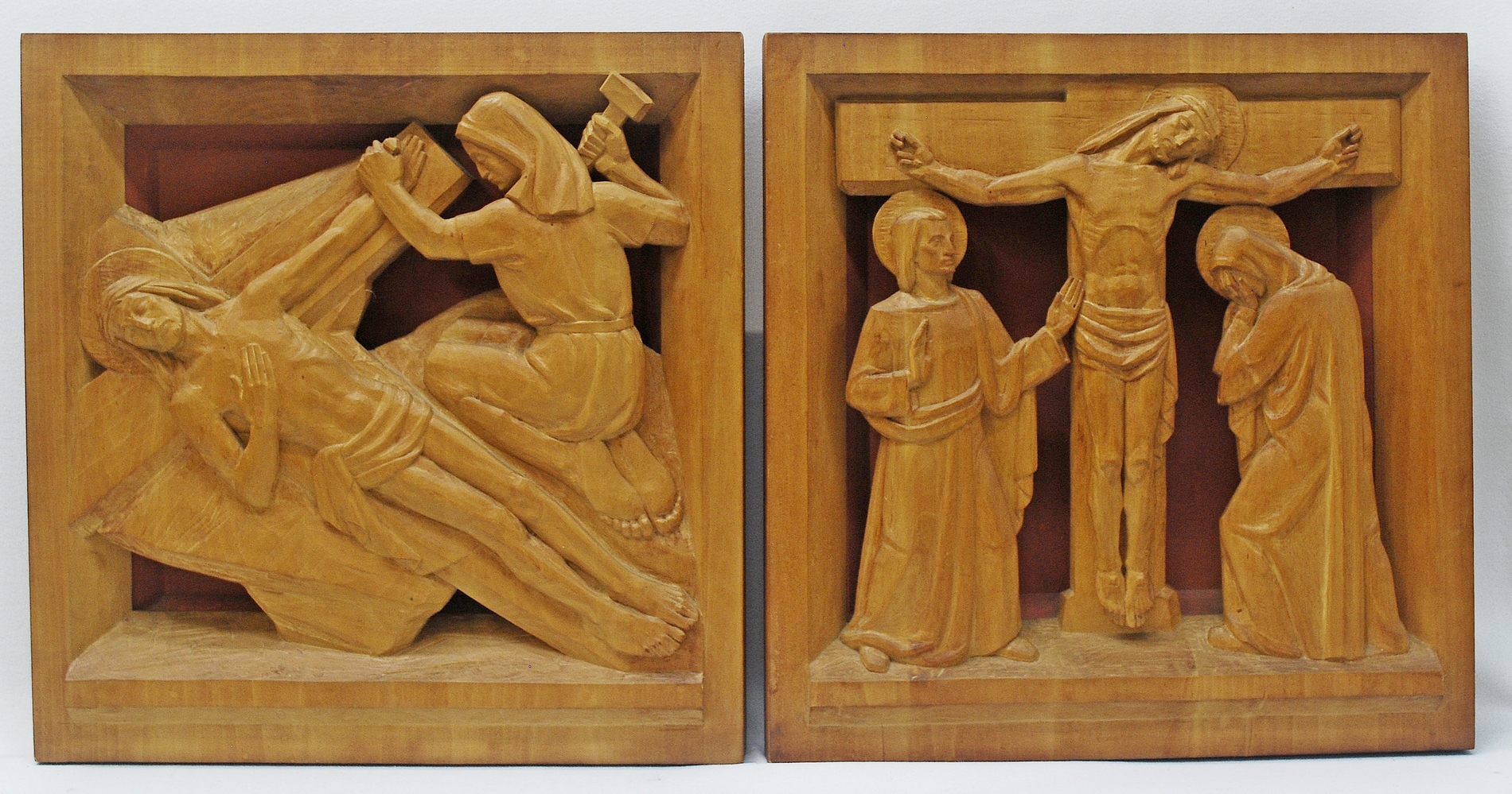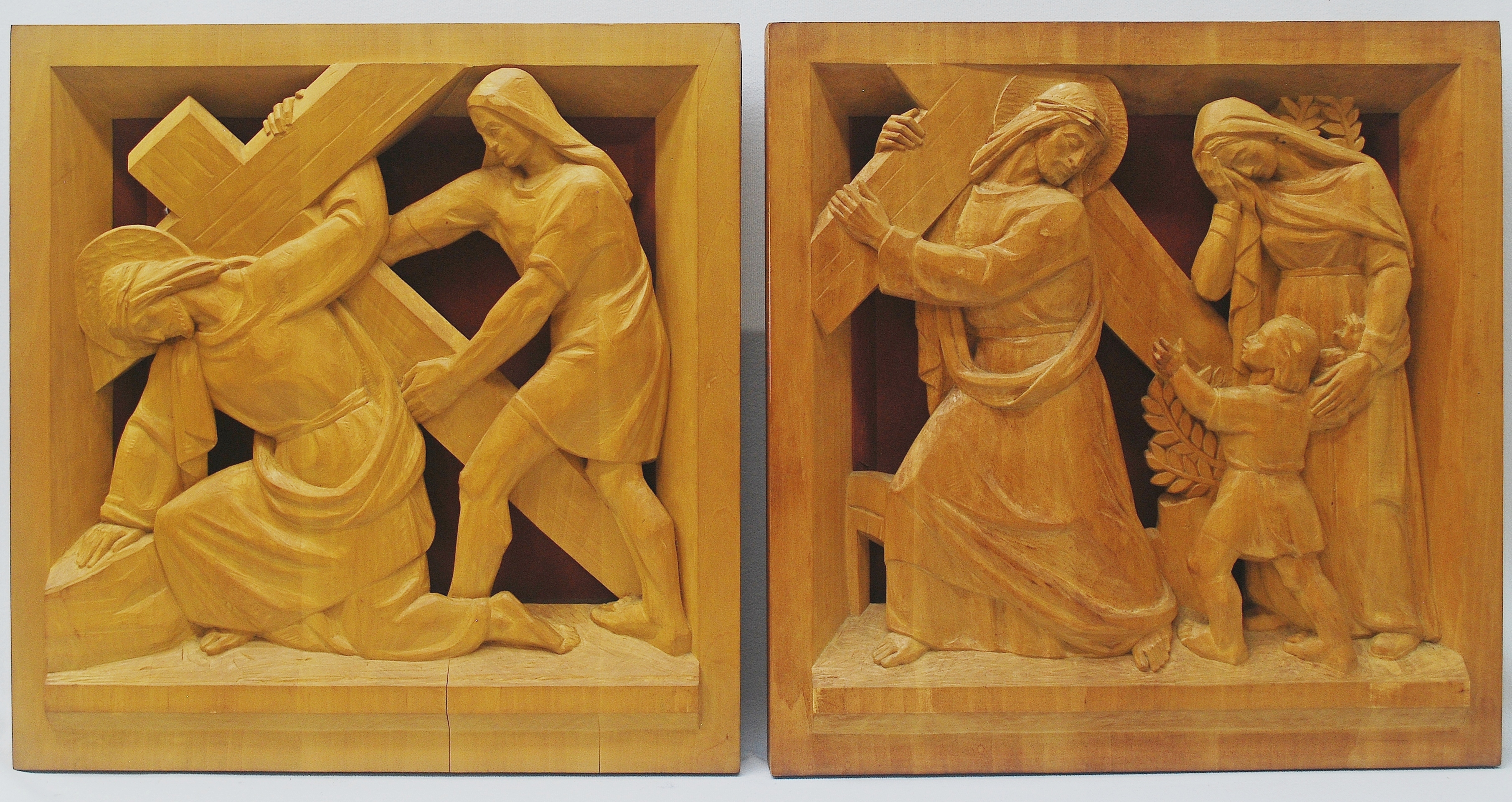 These are previously owned Stations Of the Cross. They are Woodcarved and measure 14 1/2" x 24 3/4". Please pay attention to the images as there are a few splits in some of the stations.