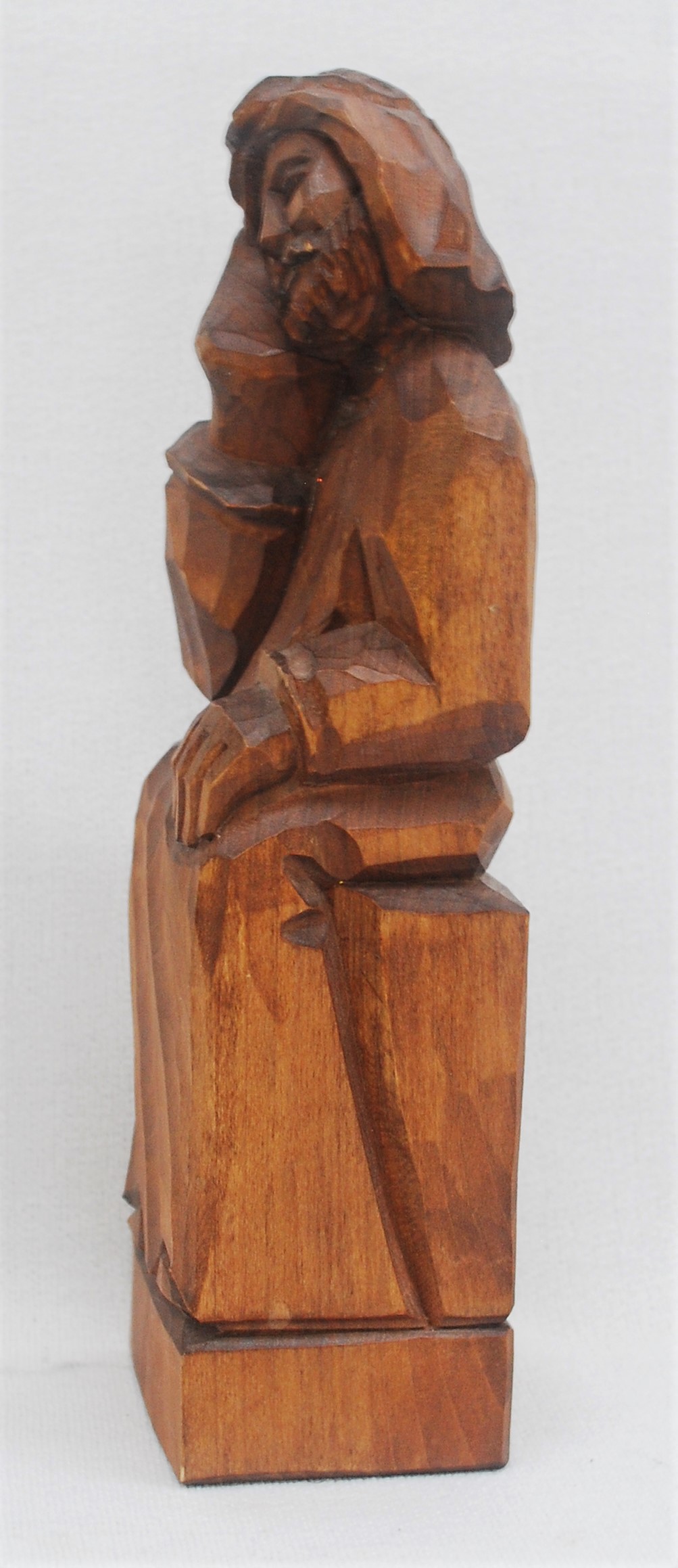 This is a previously owned woodcarved statue of pondering Christ. It is 8" tall and is in nice condition.