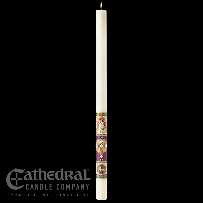 The Prince of Peace Paschal Candle celebrates the glorious message of peace that Jesus imparted to his disciples. Striking shades of burgundy, forest green and gold highlight intricate detailing while the commanding image of a triumphant Jesus Christ reminds of his eternal promise of heavenly peace.