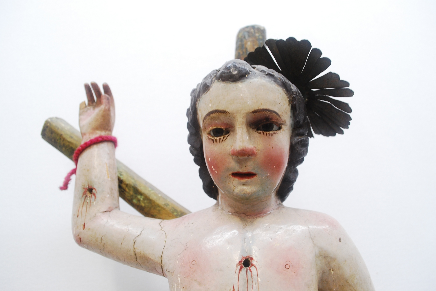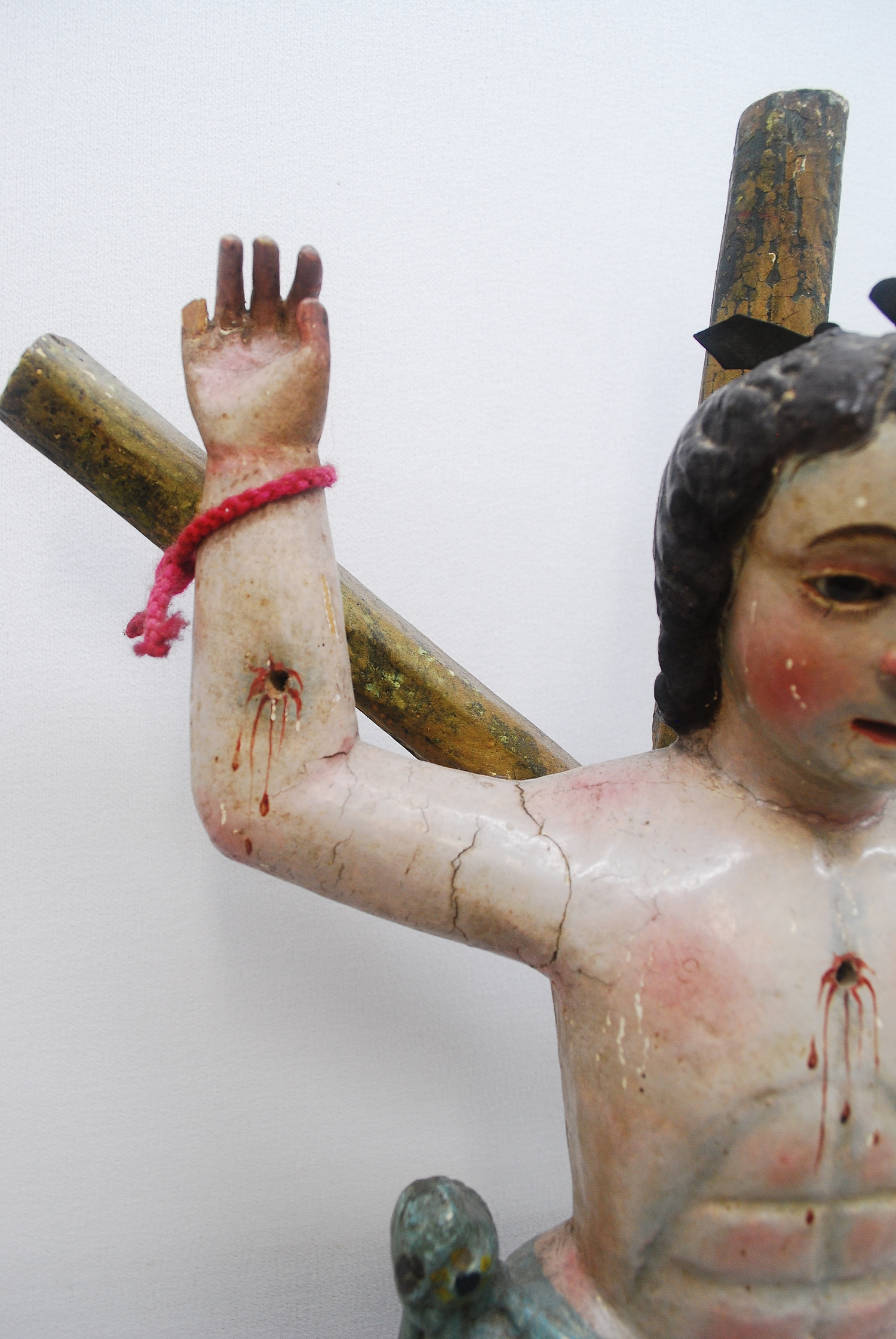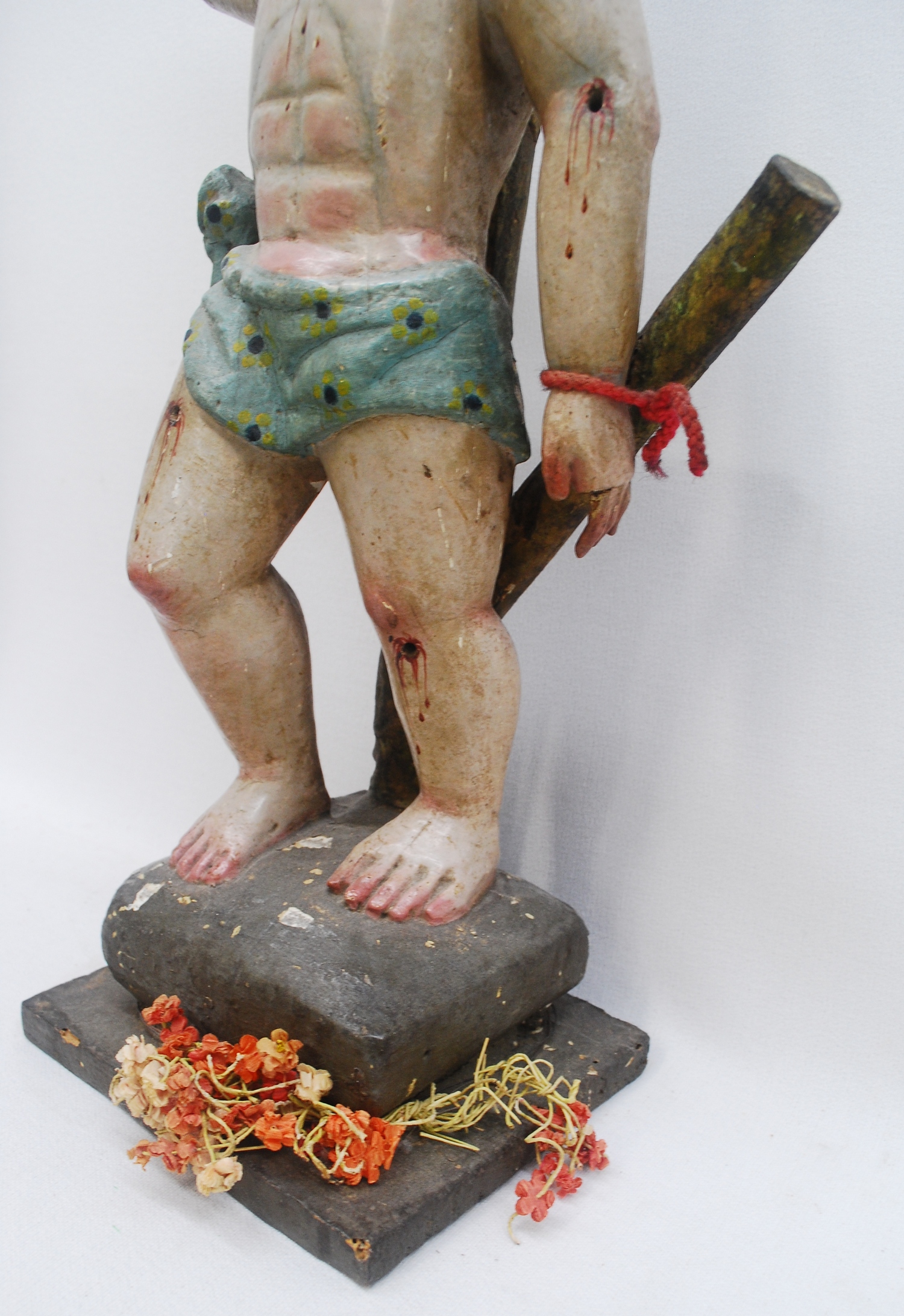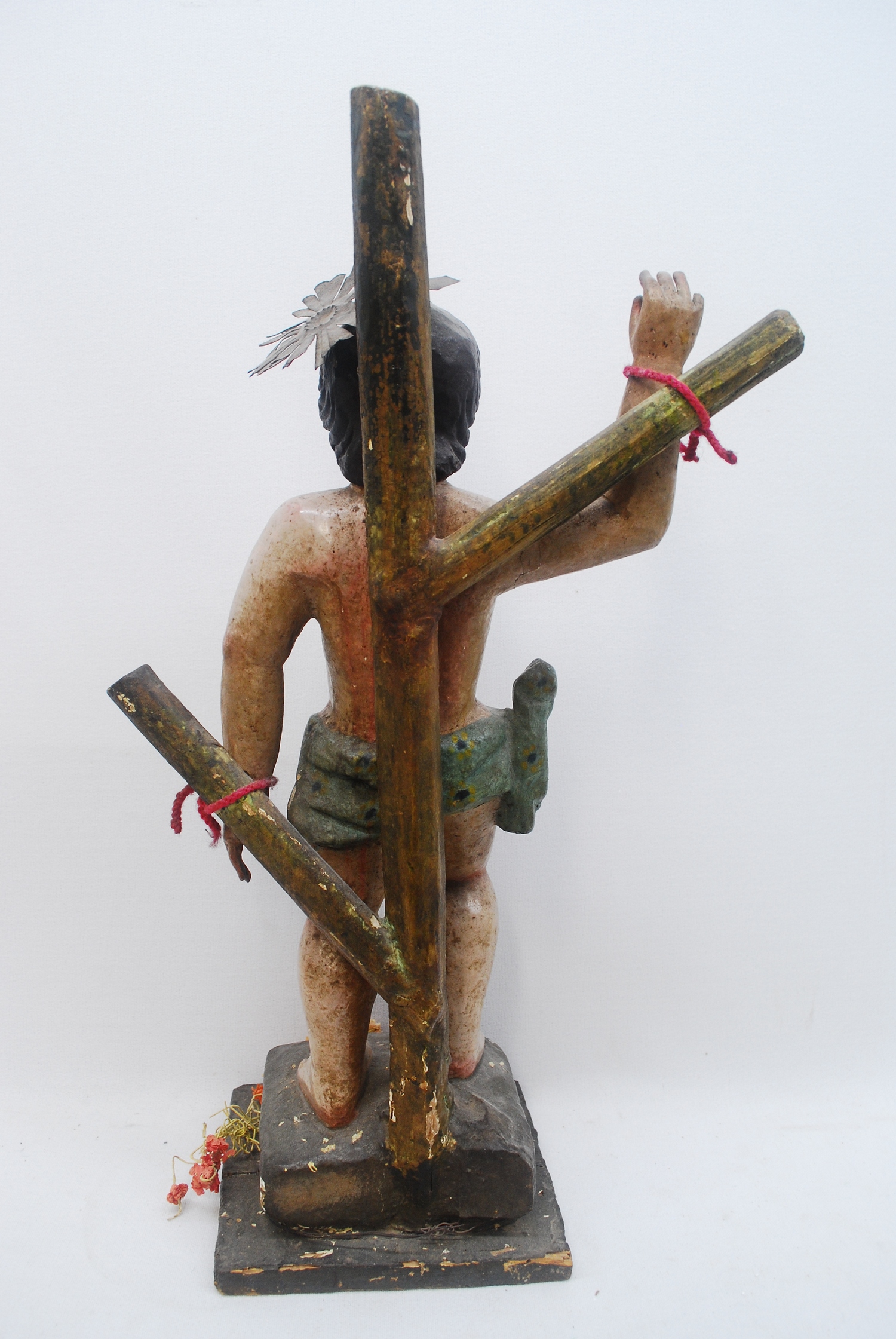 This is a previously owned vintage woodcarved St. Sebastian statue (Santos). It measures 21" tall and is in good condition.