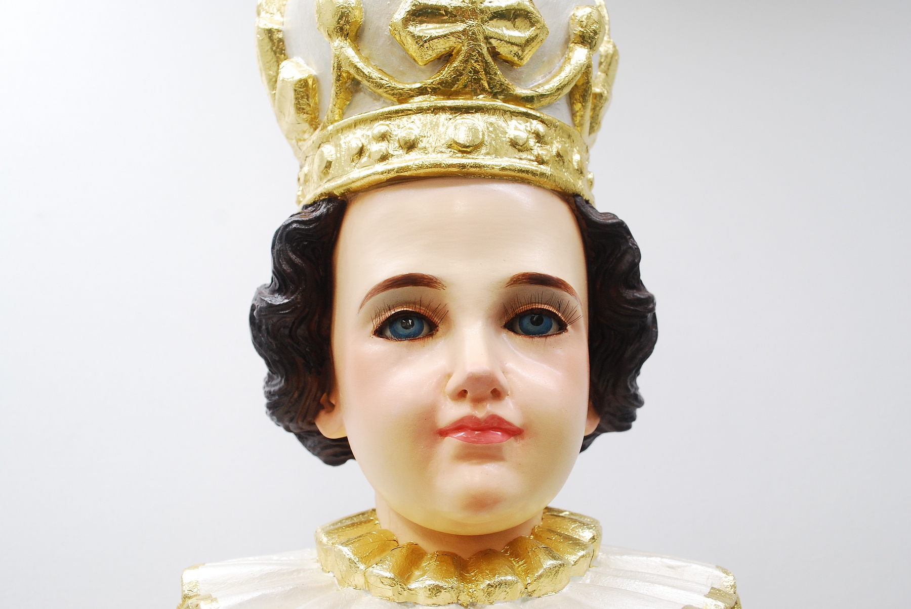 This is a previously owned woodcarved Infant of Prague featuring glass eyes. This item measures 44 1/2" tall and is in good condition.