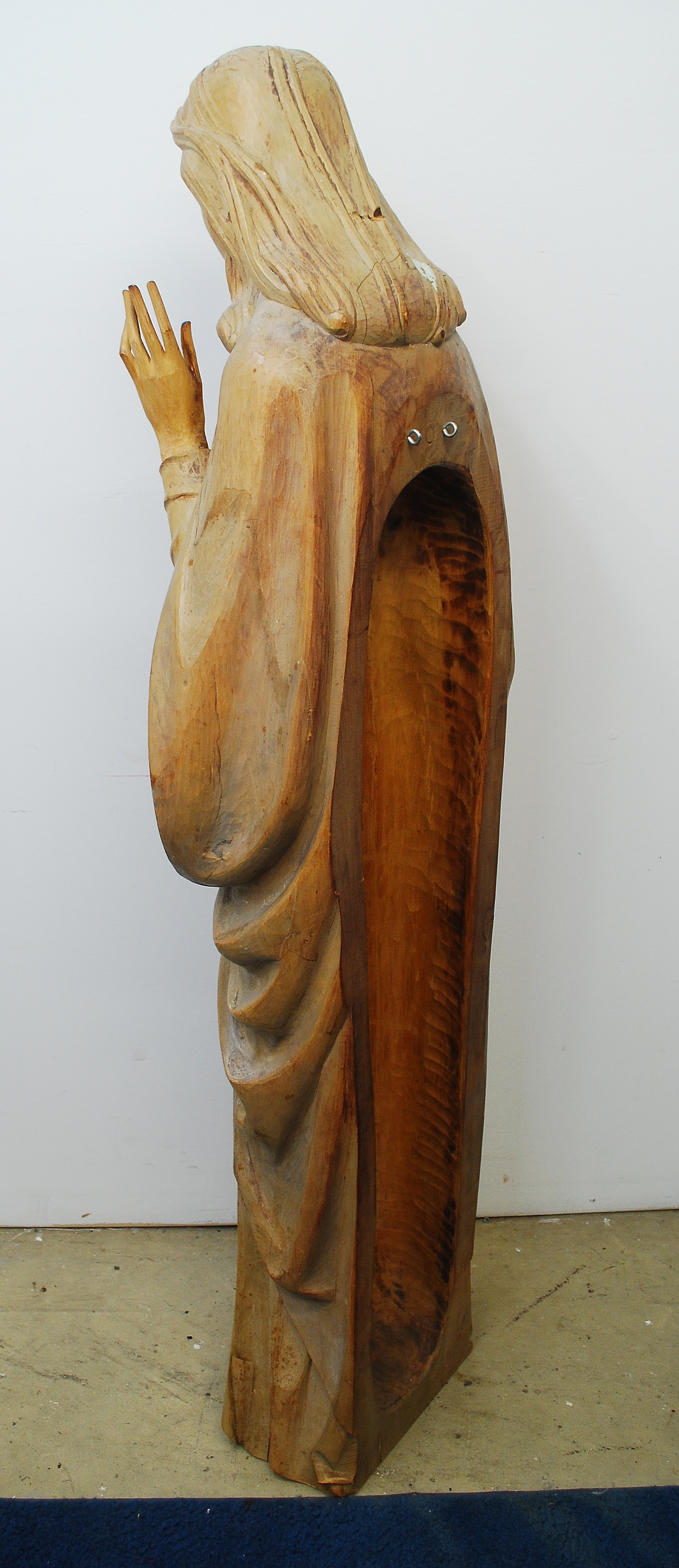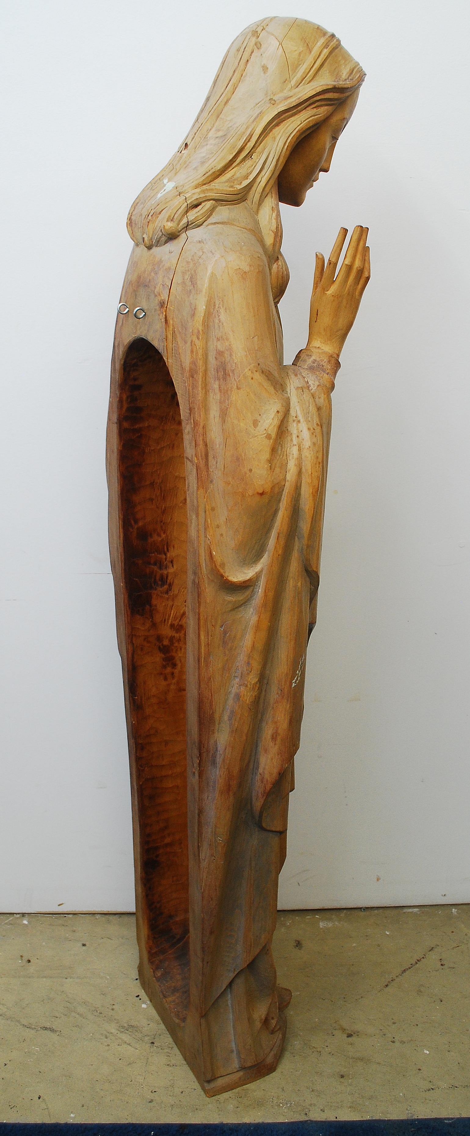 This is a previously owned woodcarved statue of Mary. It is a 3/4 relief that measures 52" tall and is in good condition.