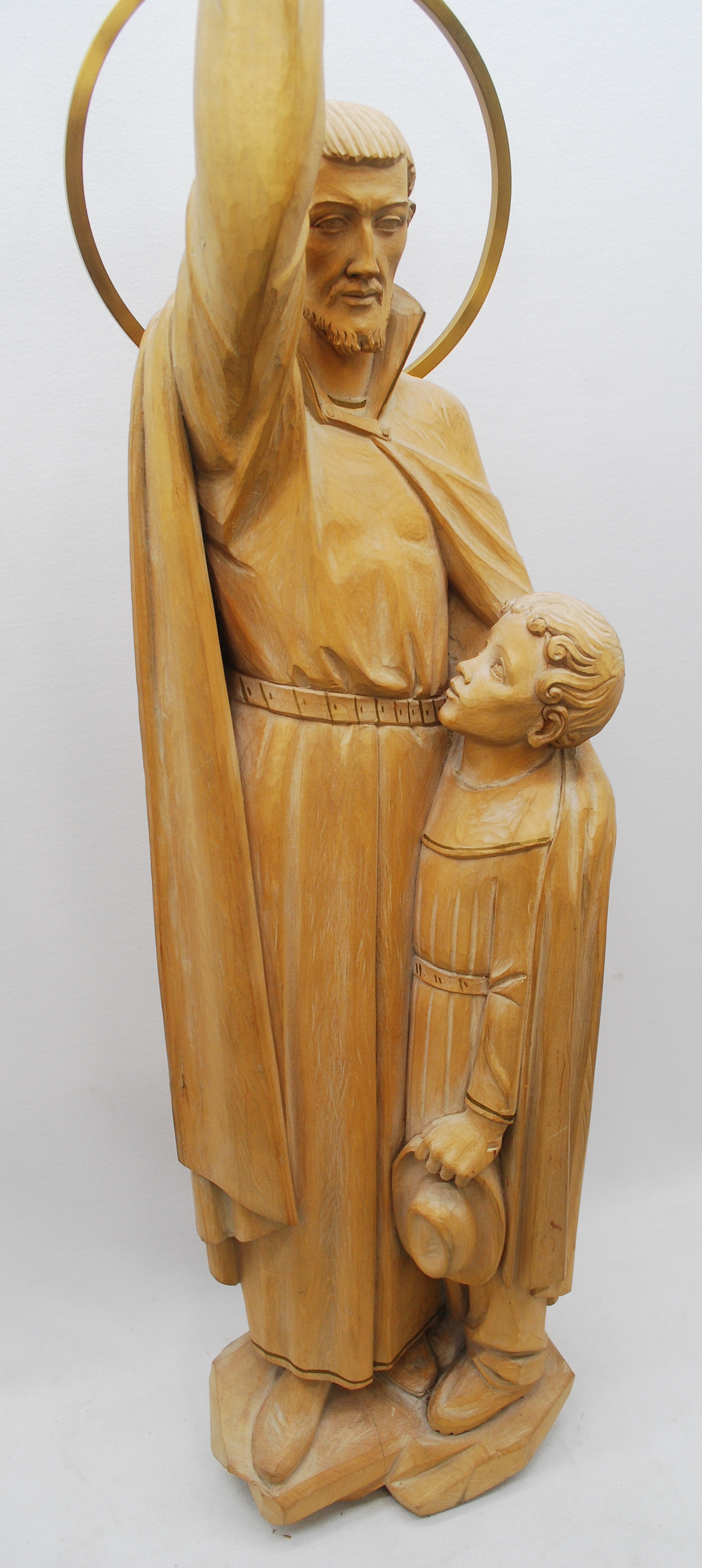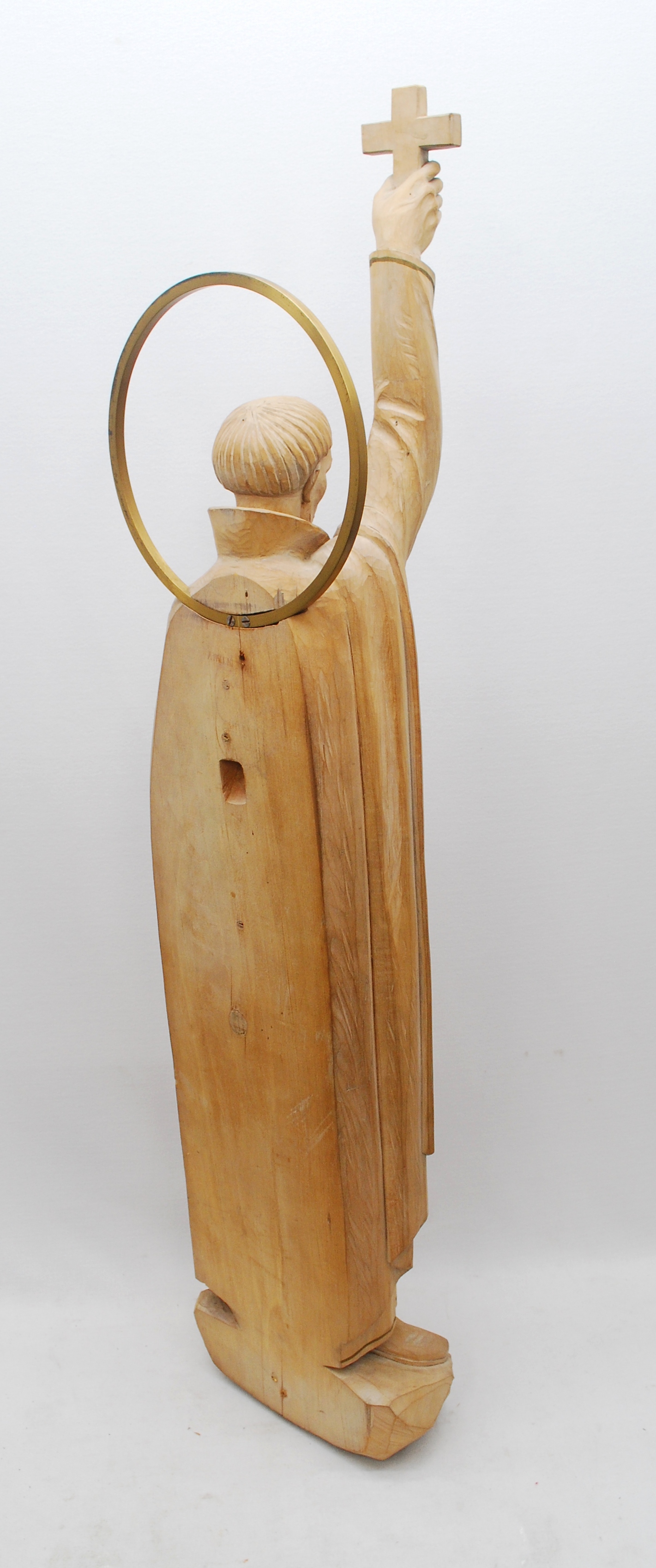 This is a previously owned woodcarved St Peter Claver with brass halo. This item measures 32" tall, measured up to the halo being 39 1/2" tall, and is in good condition.