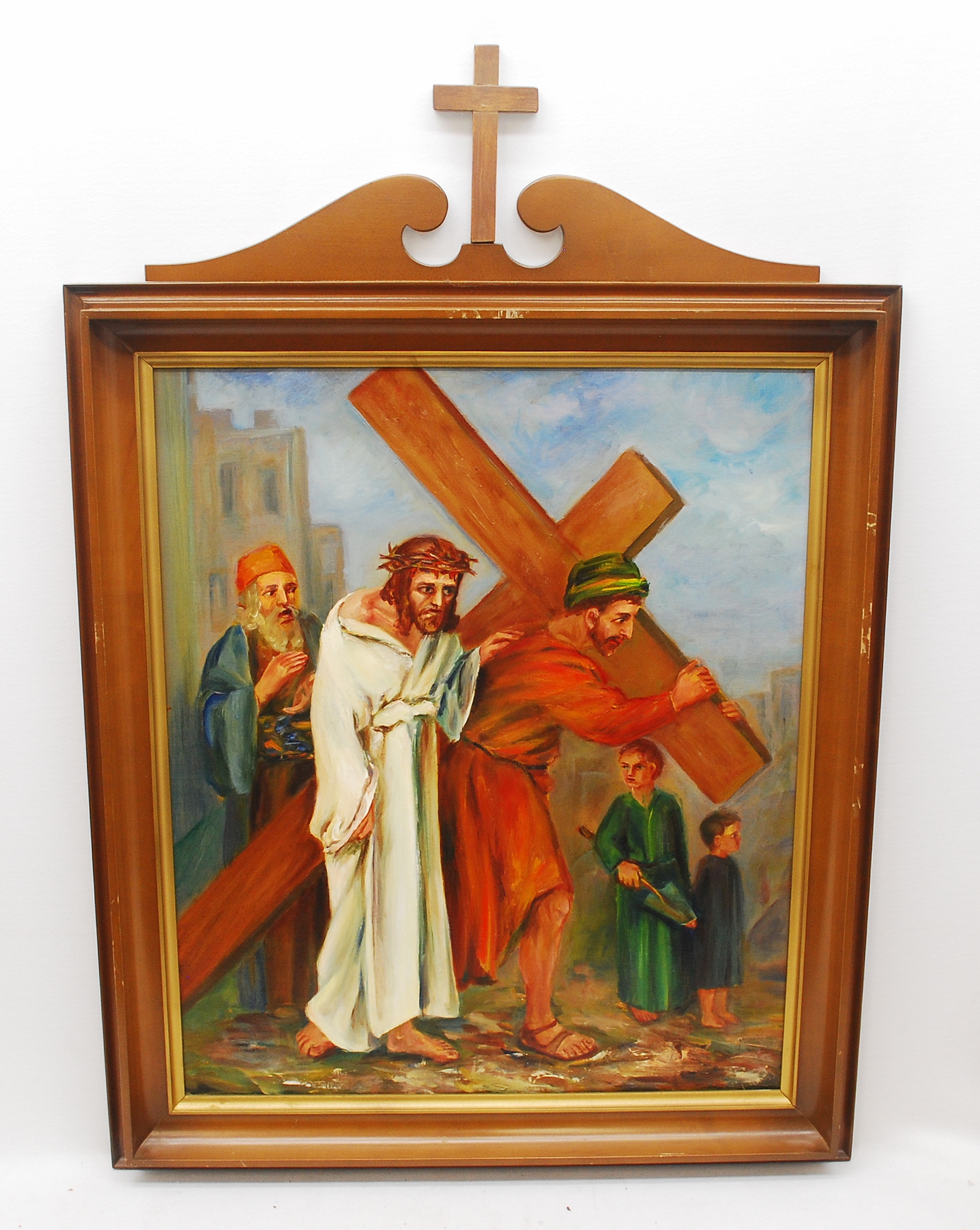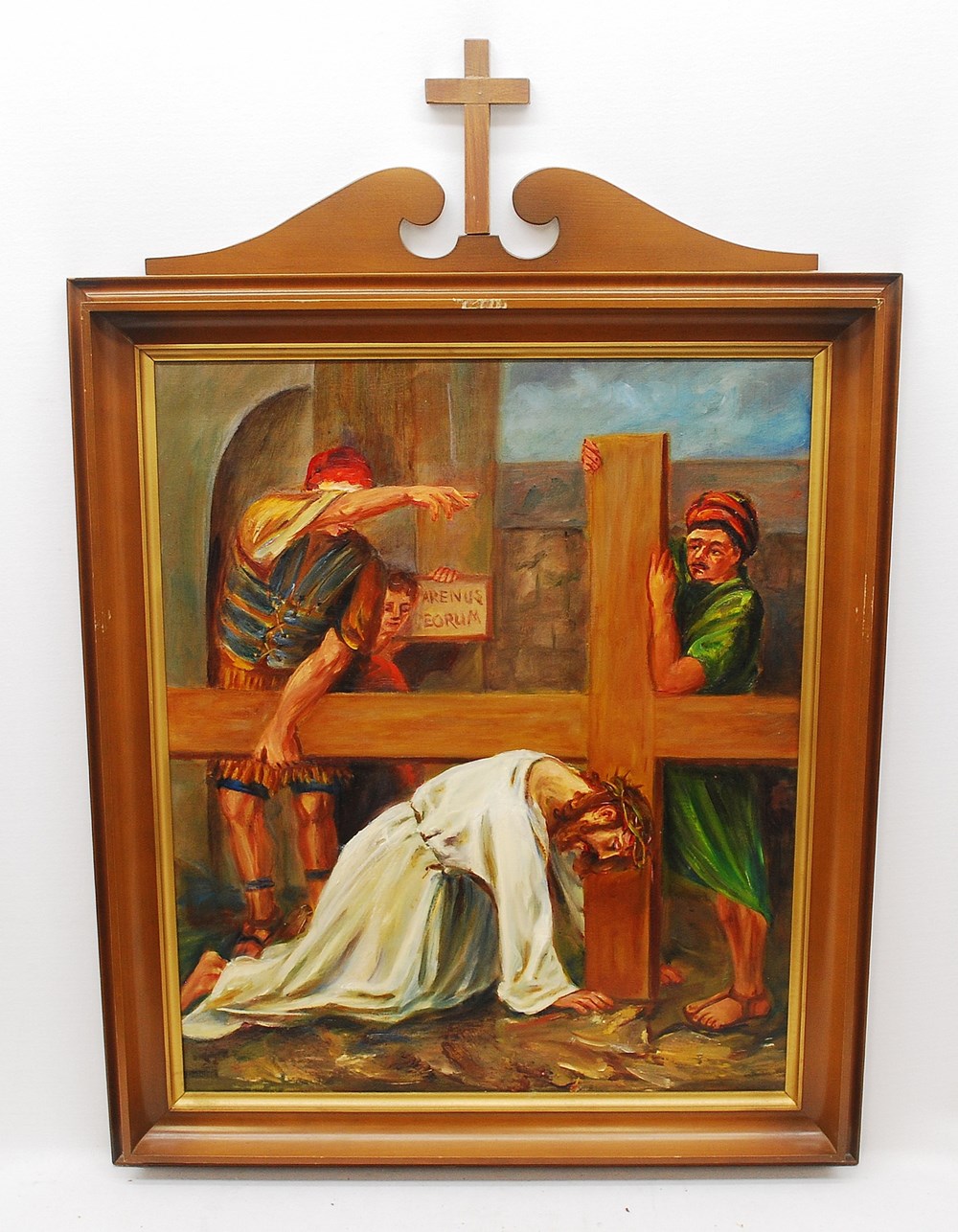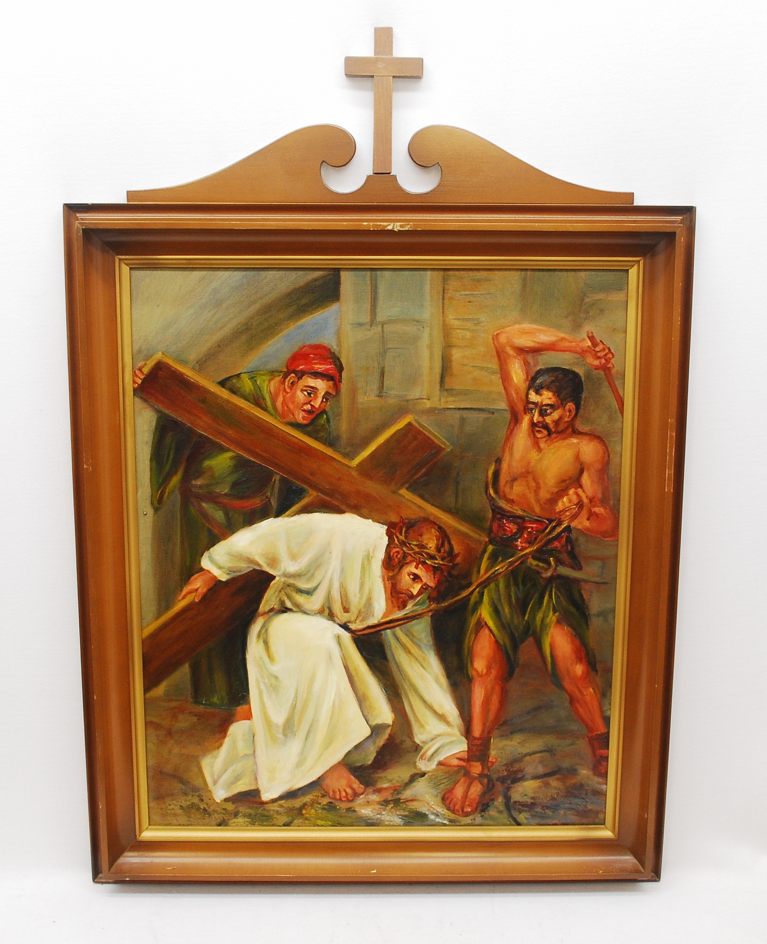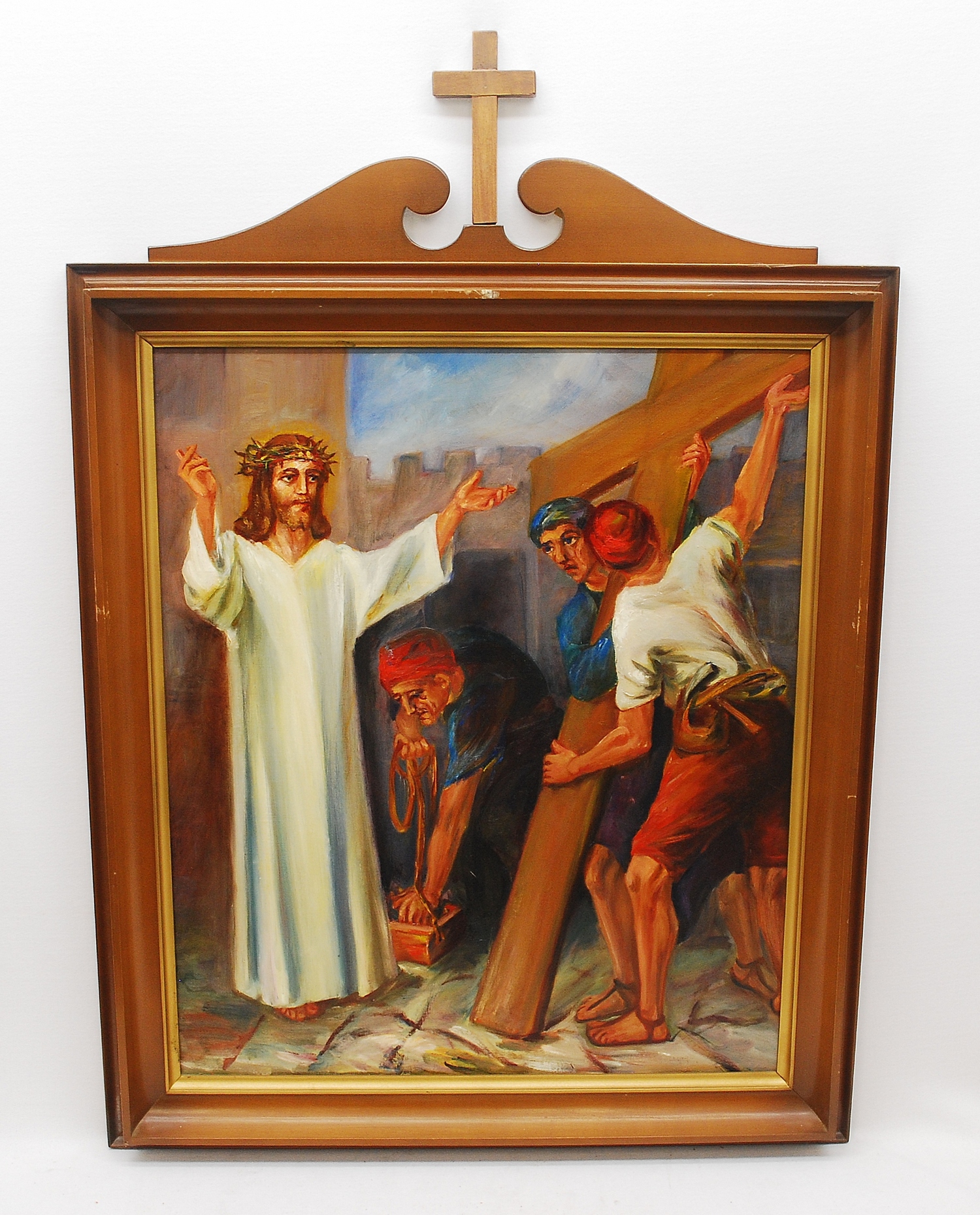This is a previously owned set of stations of the cross that measure 35 1/4" tall x 24 1/2" wide overall. These stations are original oil paintings in a wood frame and are ready for use. Please note that there are some scratches on the frames that could use touch up.