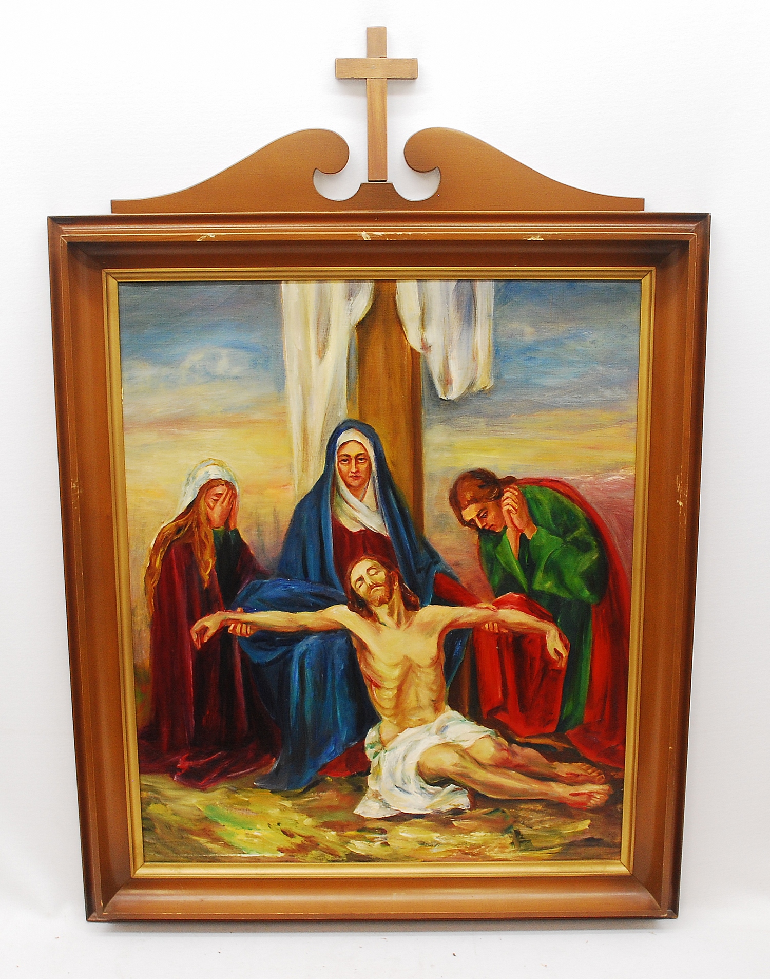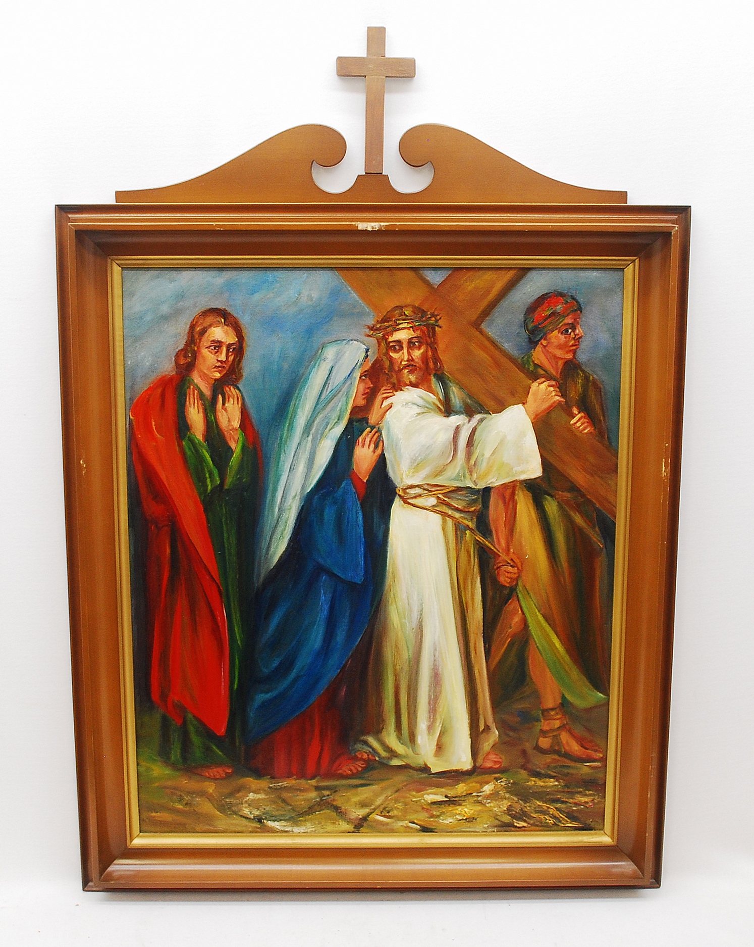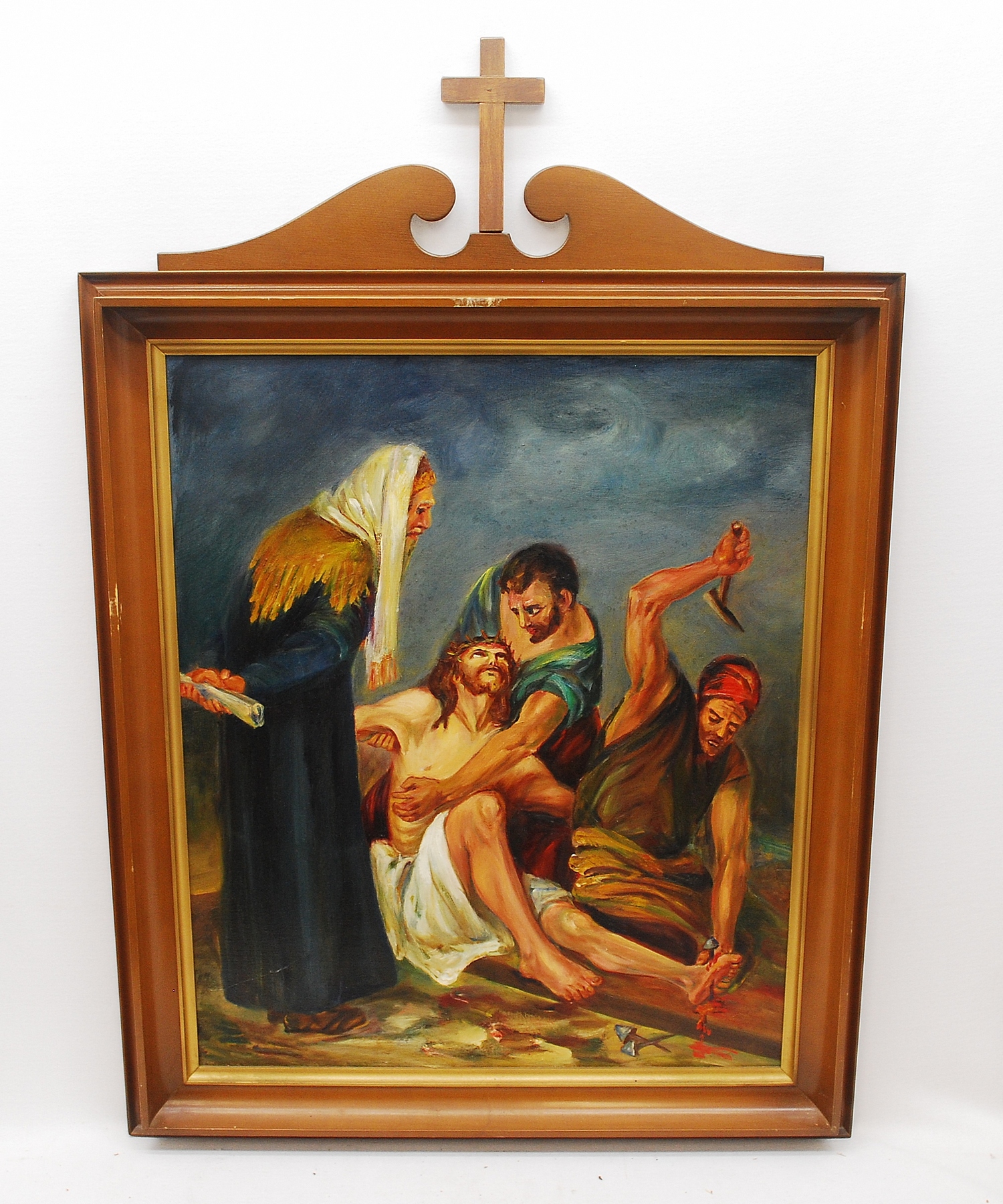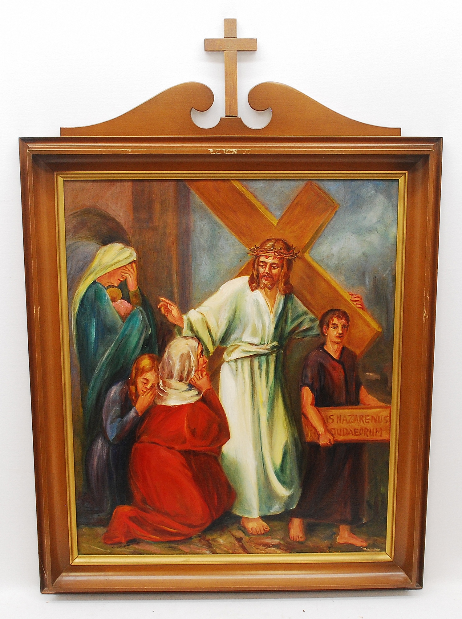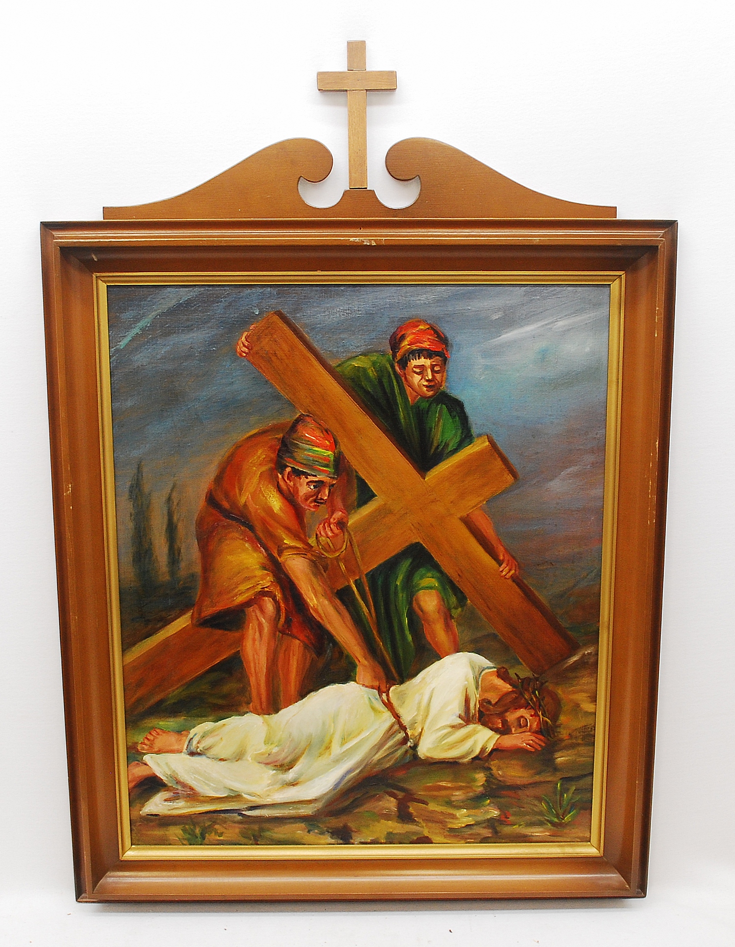 This is a previously owned set of stations of the cross that measure 35 1/4" tall x 24 1/2" wide overall. These stations are original oil paintings in a wood frame and are ready for use. Please note that there are some scratches on the frames that could use touch up.