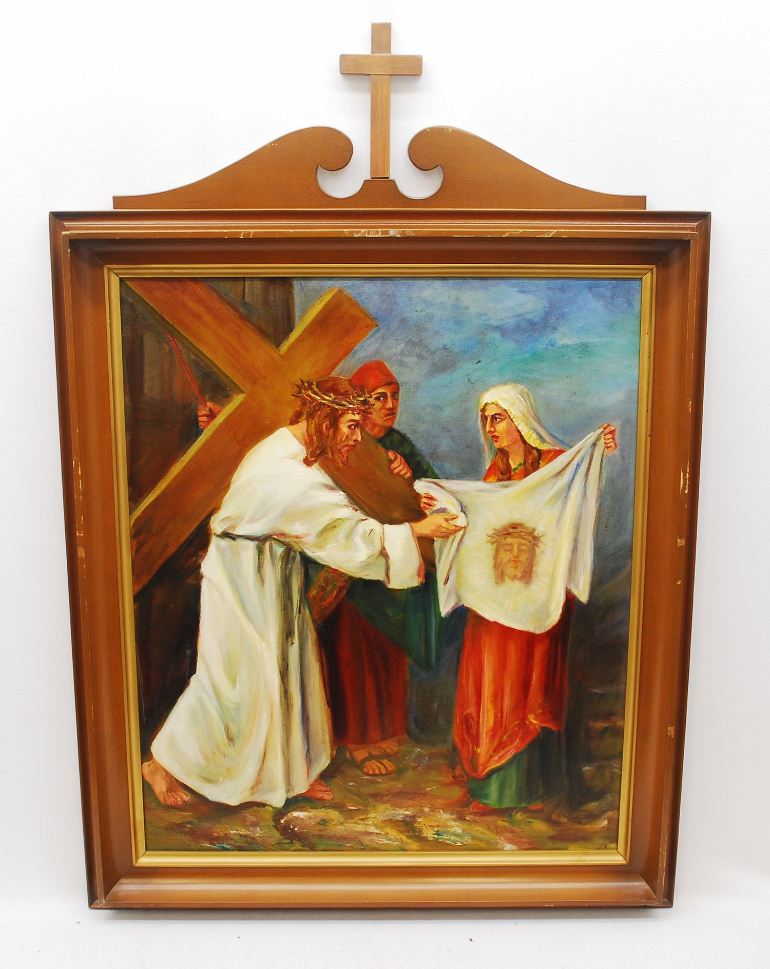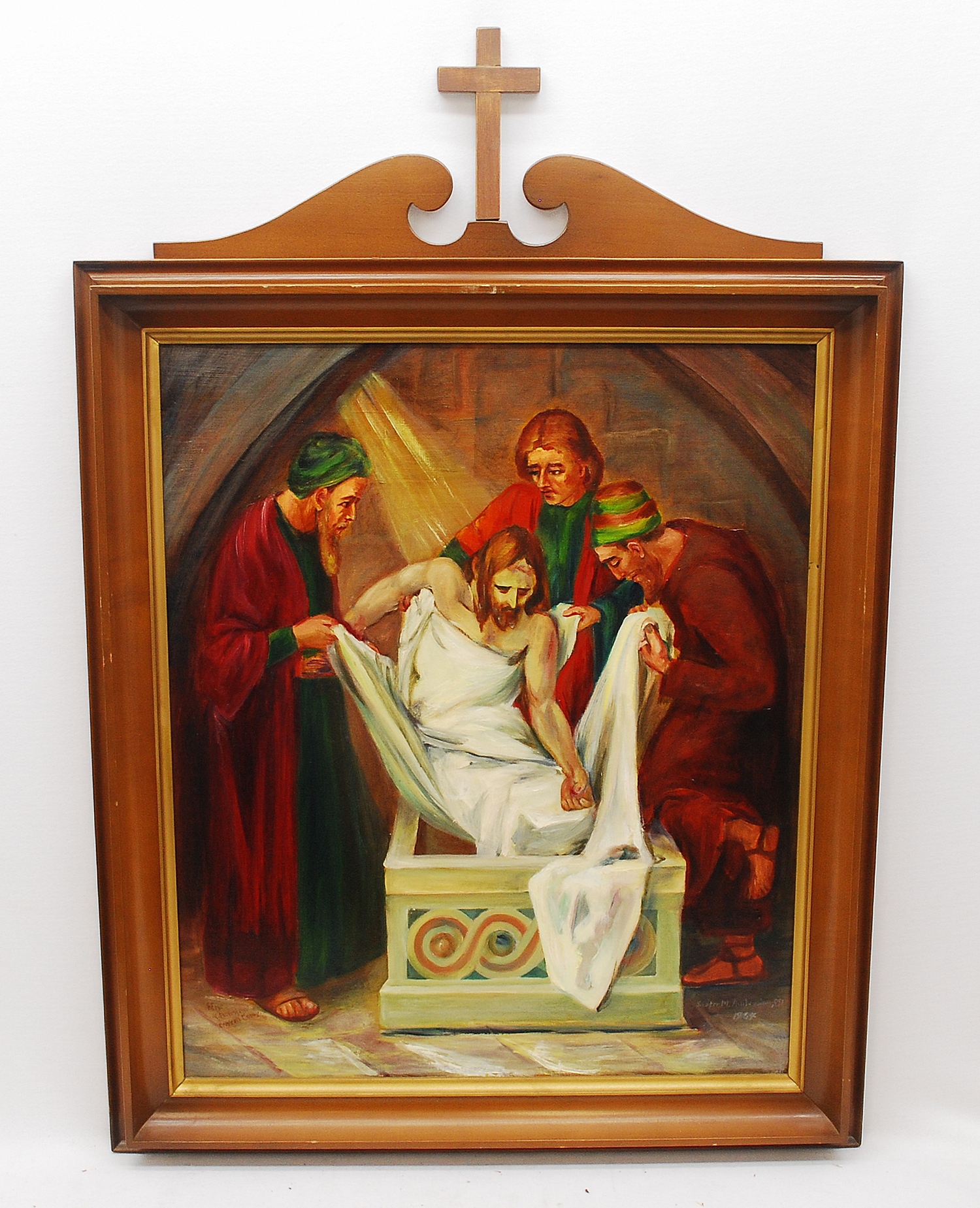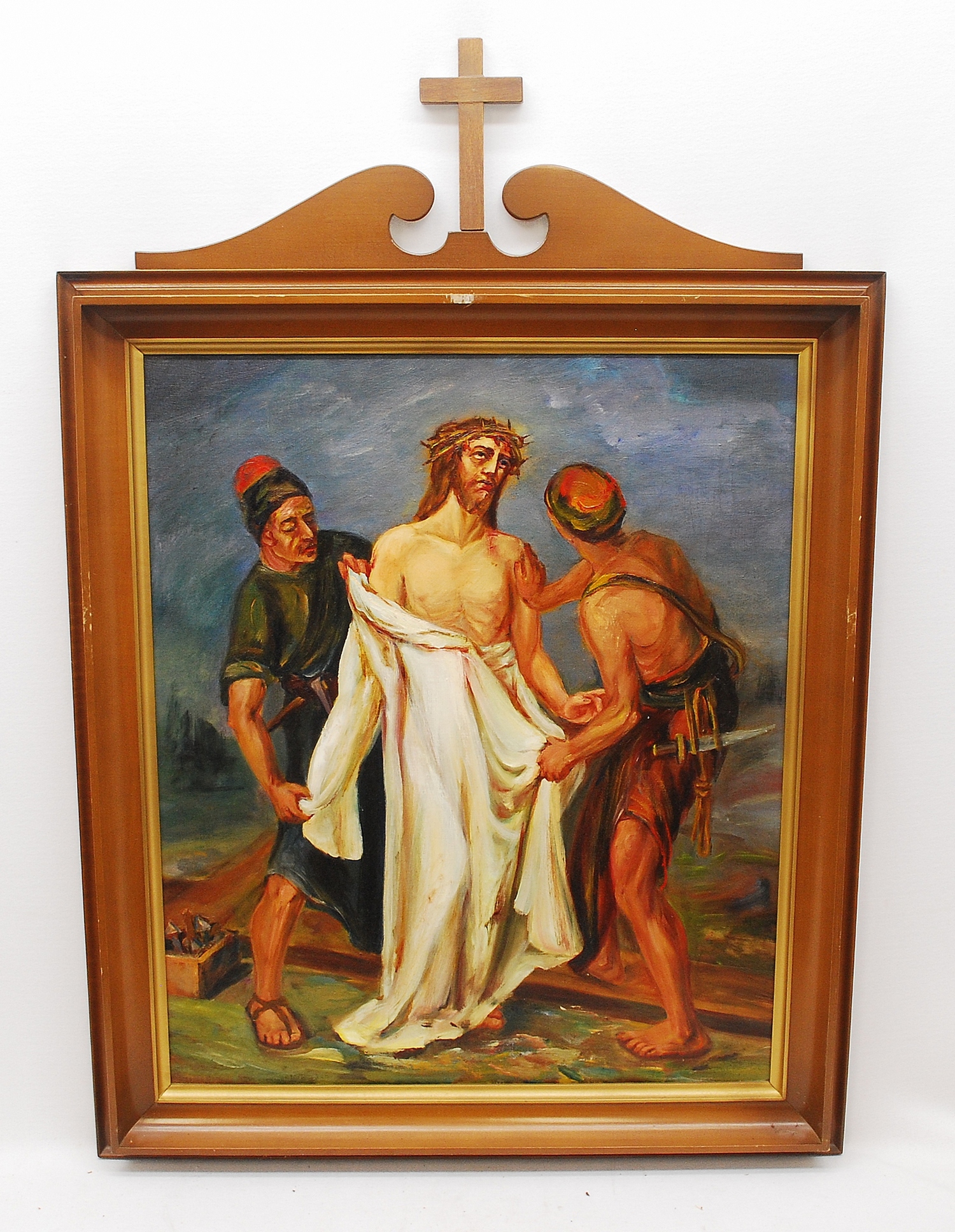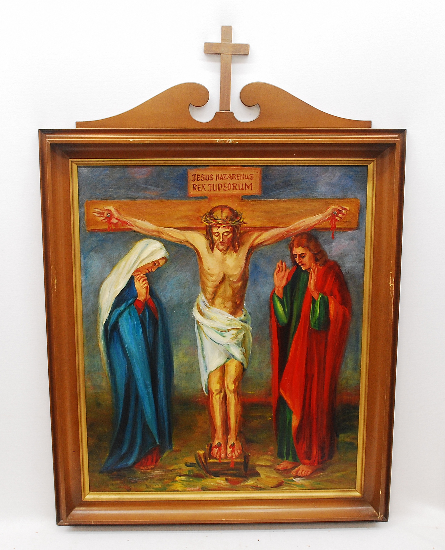 This is a previously owned set of stations of the cross that measure 35 1/4" tall x 24 1/2" wide overall. These stations are original oil paintings in a wood frame and are ready for use. Please note that there are some scratches on the frames that could use touch up.