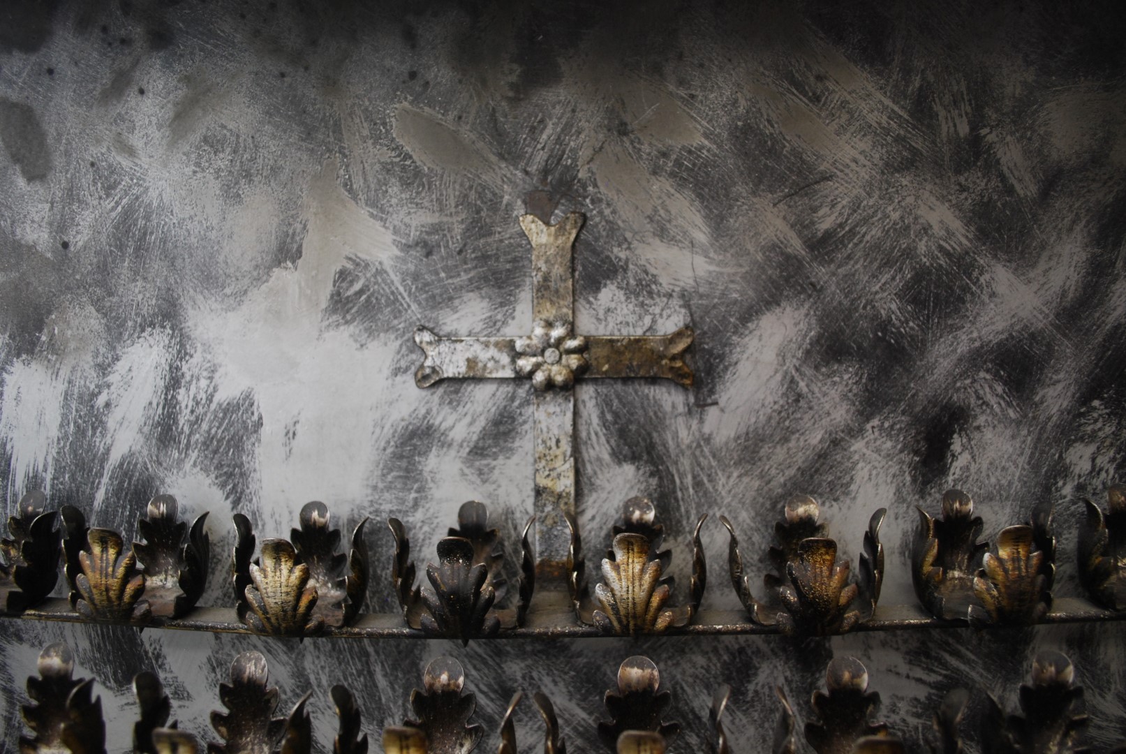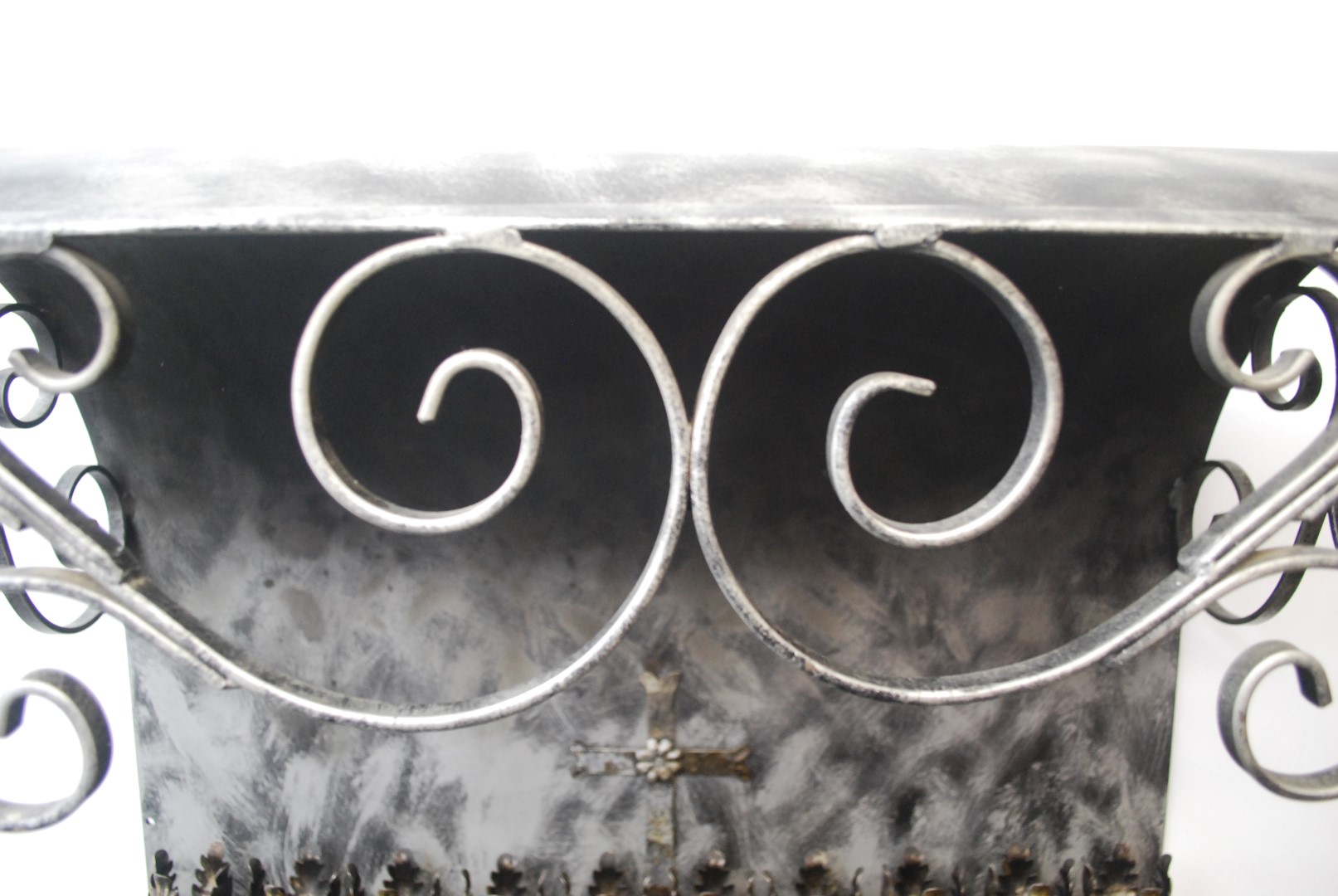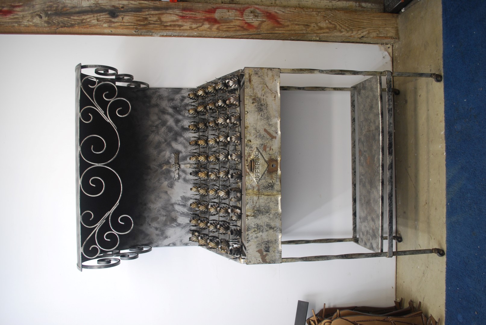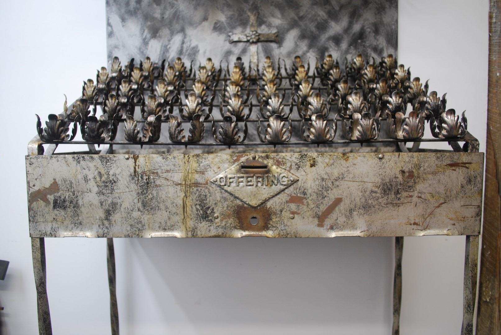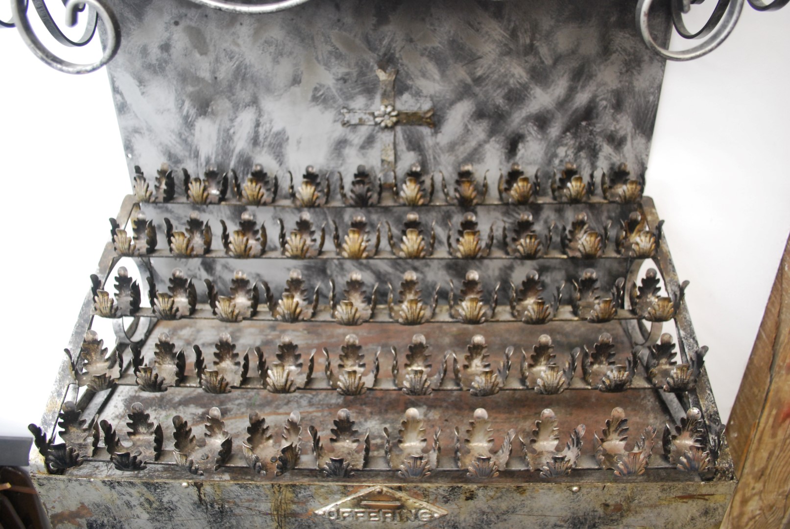 This is a previously used 50-lite votive stand with hood. It is wrought iron in the color of black with a silver brush finish. and is in good useable condition.
