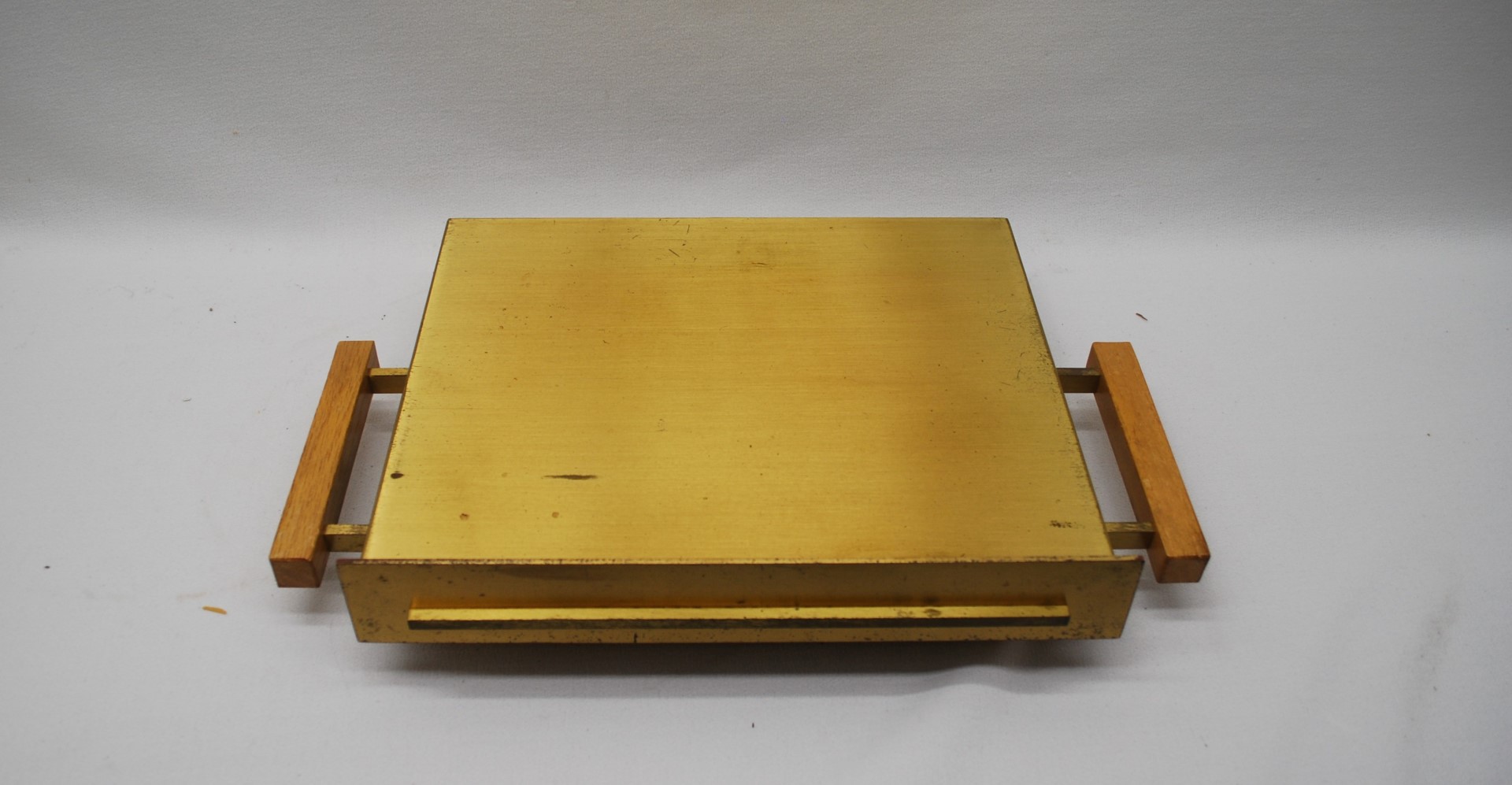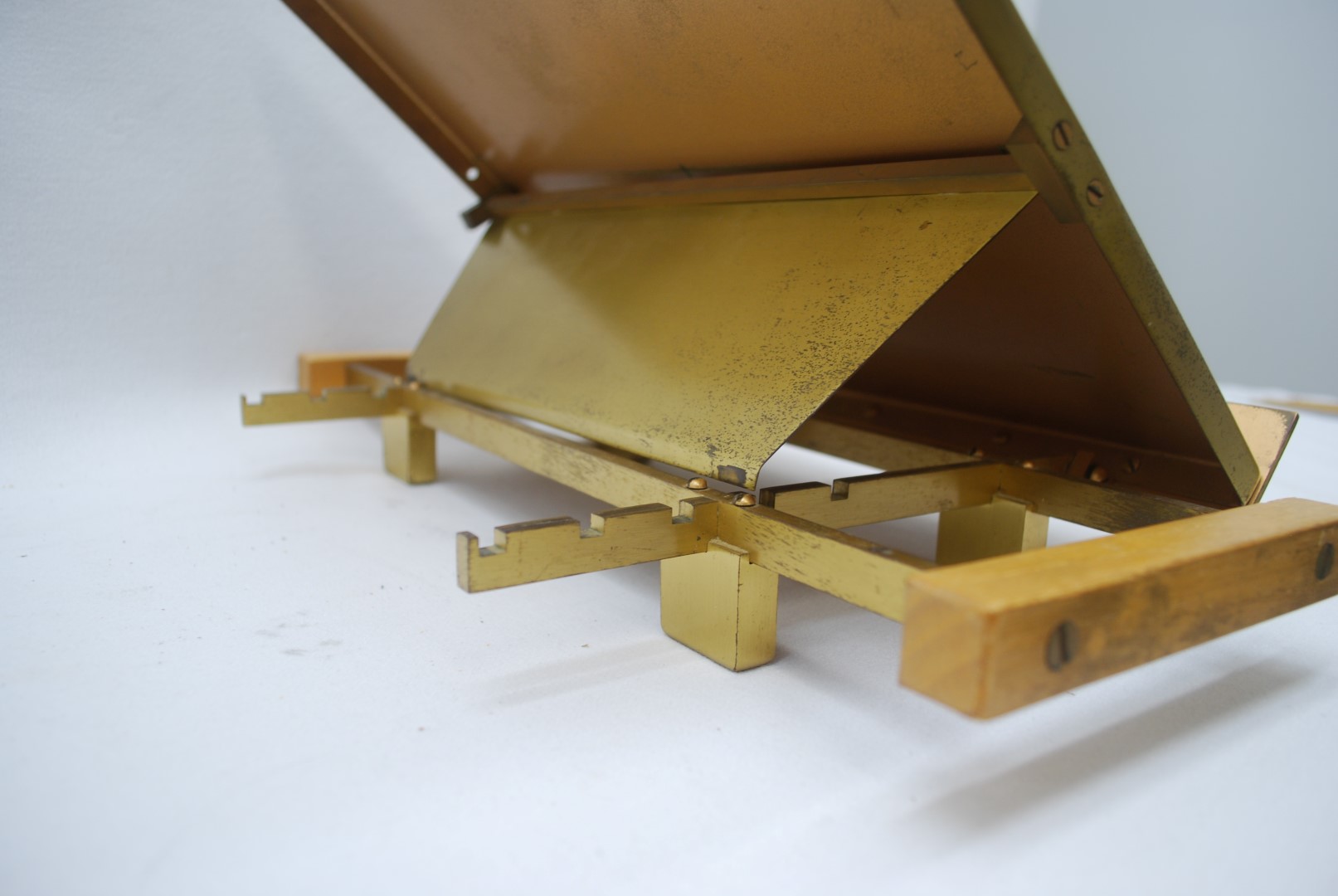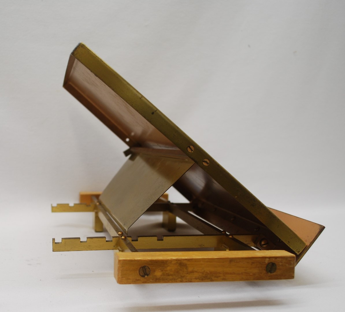 This is a previously used Adjustable Height Bookstand in Satin Bronze with Wooden Handles on the Sides The book surface measurements are 11" x 13" x 16-3/4".