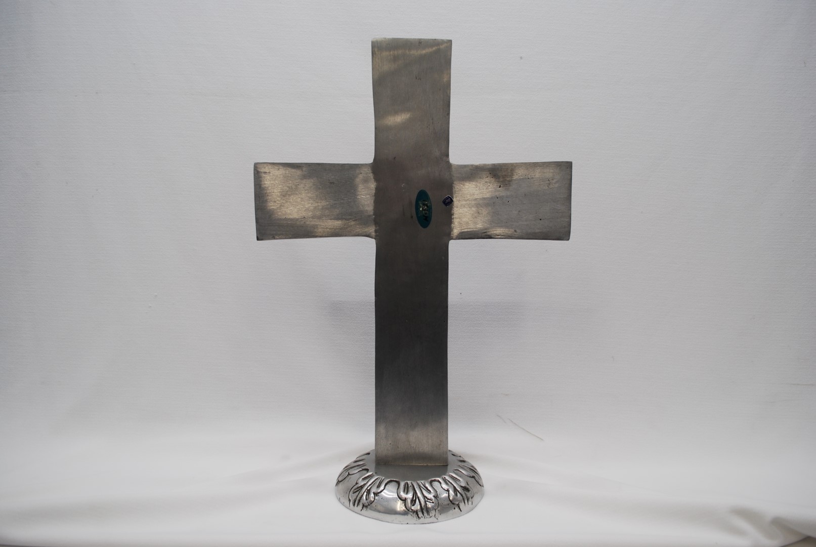 This is a previously owned 22-1/2" Cast Aluminum Cross with a Round Base and Flower Design that was made in Mexico. This item is beautiful and is in good usable condition.