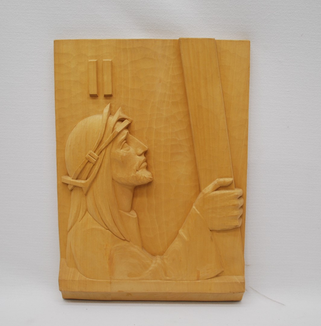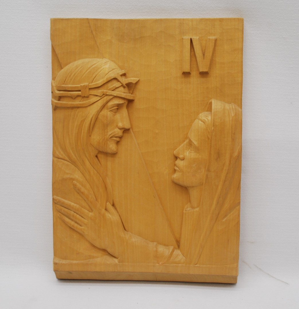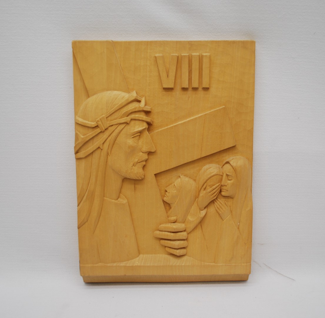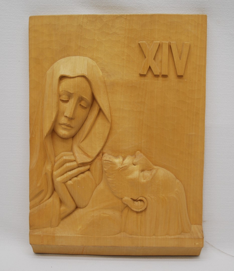 This is a previously used set of 14 15-3/4" x 11-1/4" Lindenwood Carved Wall Mount Stations of the Cross in a Natural Finish. With this set comes 14 24" x 19-1/2" x 3-1/2" hardwood Shelf Mounts. They come with crosses as well.These items are in great condition, and are ready to be used.